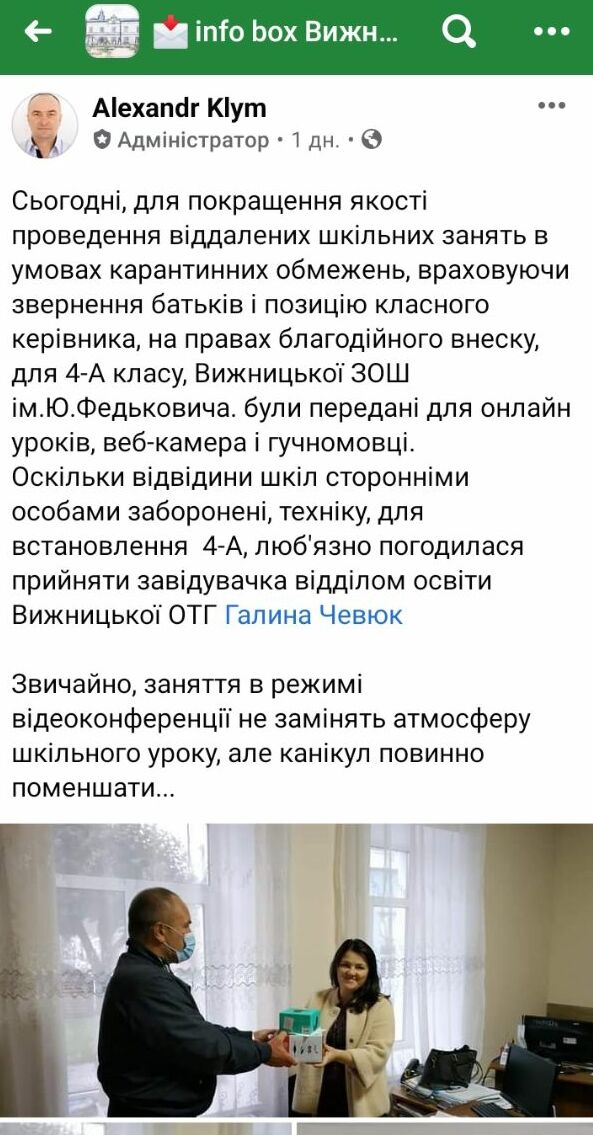 13 вересня на фейсбук-сторінці “info-box Вижниця’’ Олександр Клим, як адміністратор сторінки, опублікував такий пост: ‘‘Сьогодні, для покращення якості проведення віддалених шкільних занять в умовах карантинних обмежень, враховуючи звернення батьків і позицію класного керівника, на правах благодійного внеску, для 4-А класу, Вижницької ЗОШ ім.Ю.Федьковича були передані для онлайн уроків, веб-камера і гучномовці. Оскільки відвідини шкіл сторонніми особами заборонені, техніку, для встановлення 4-А, люб'язно погодилася прийняти завідувачка відділом освіти Вижницької ОТГ Галина Чевюк”.