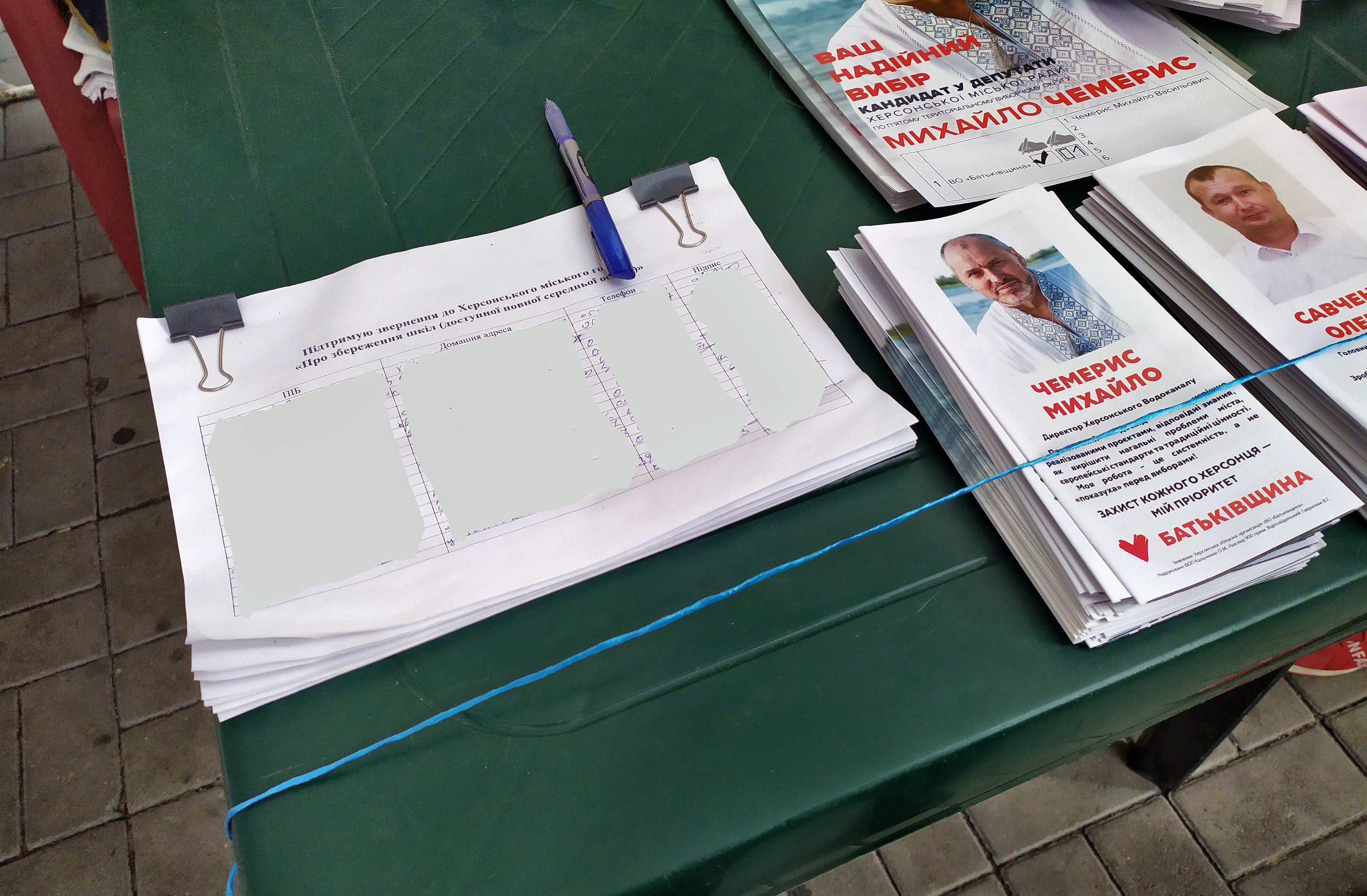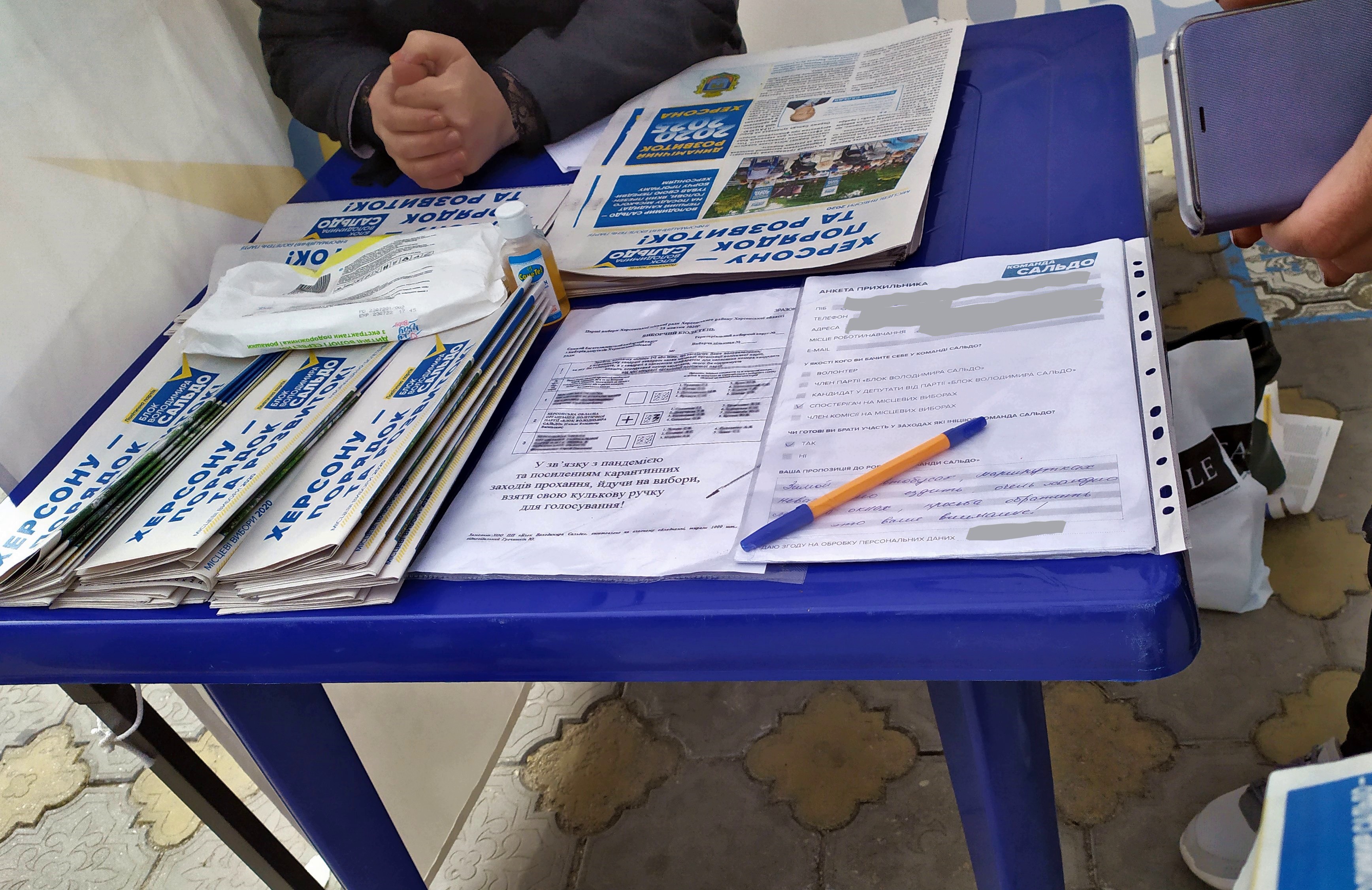 Агітатори кількох партій пропонують виборцям заповнити анкети, вказавши свої персональні дані. У наметі партії «Опозиційна платформа – За життя» роздають медичні маски з партійною символікою. ОПОРА дізналася, як агітують кандидати у Херсонській області.