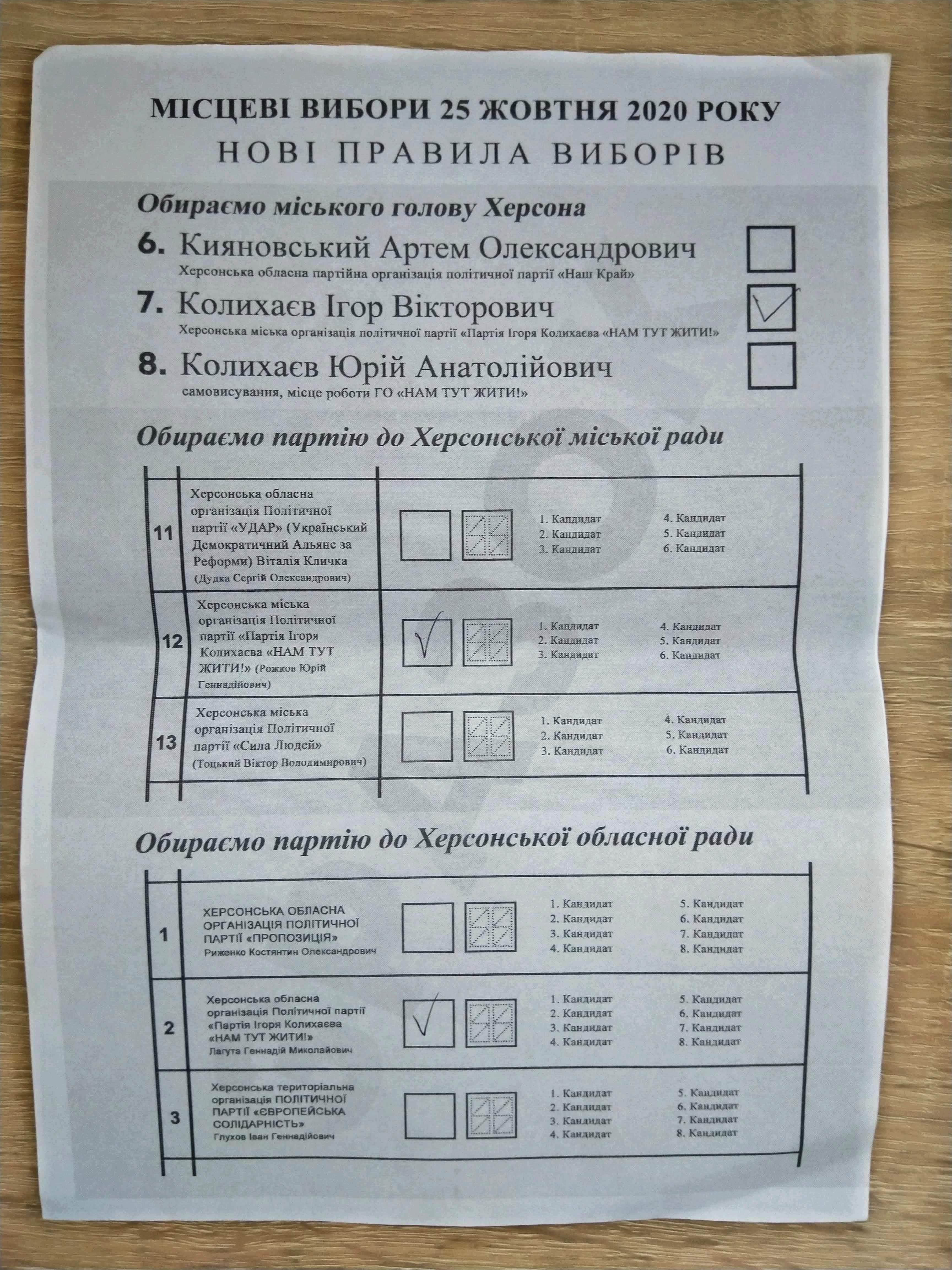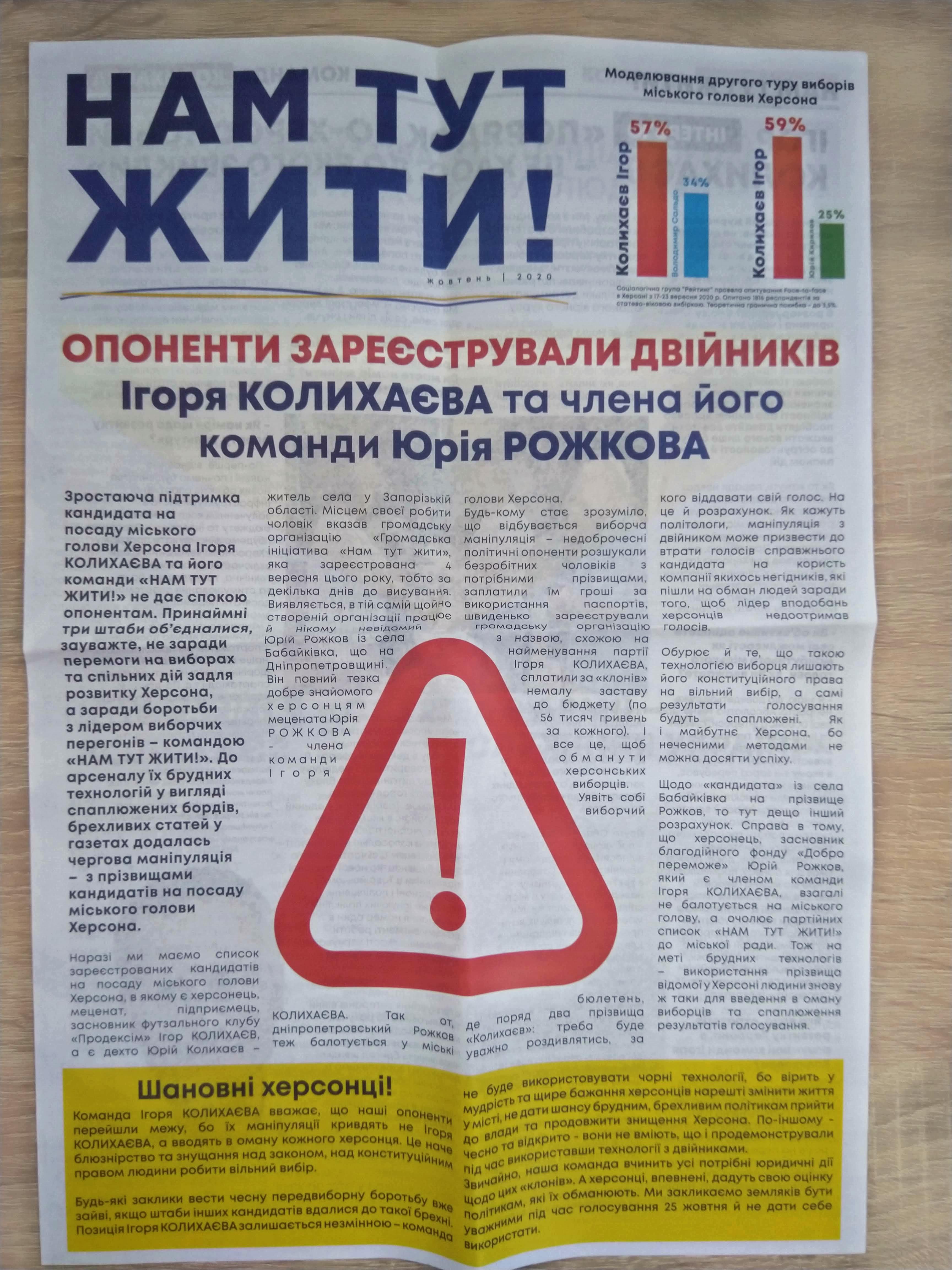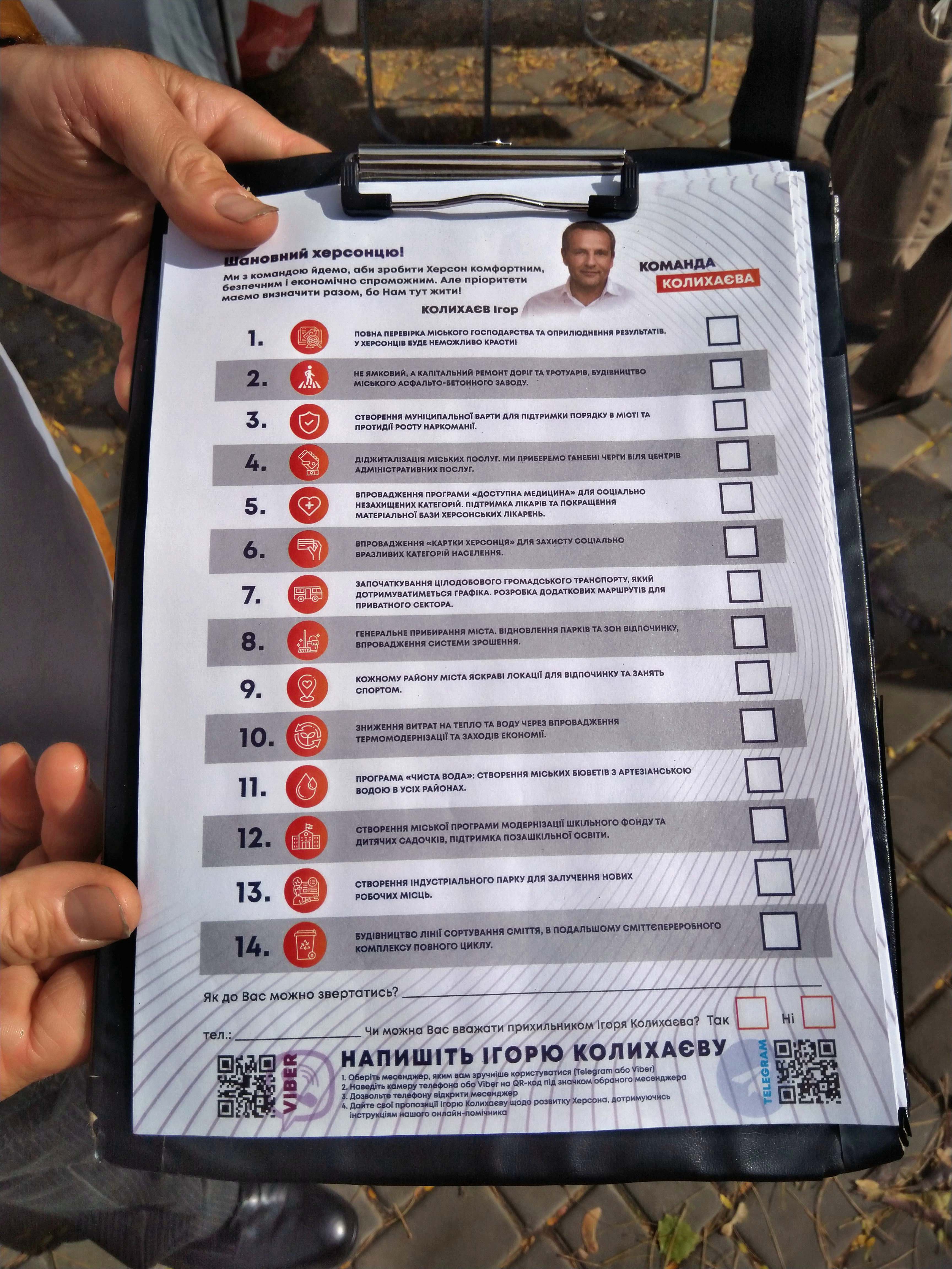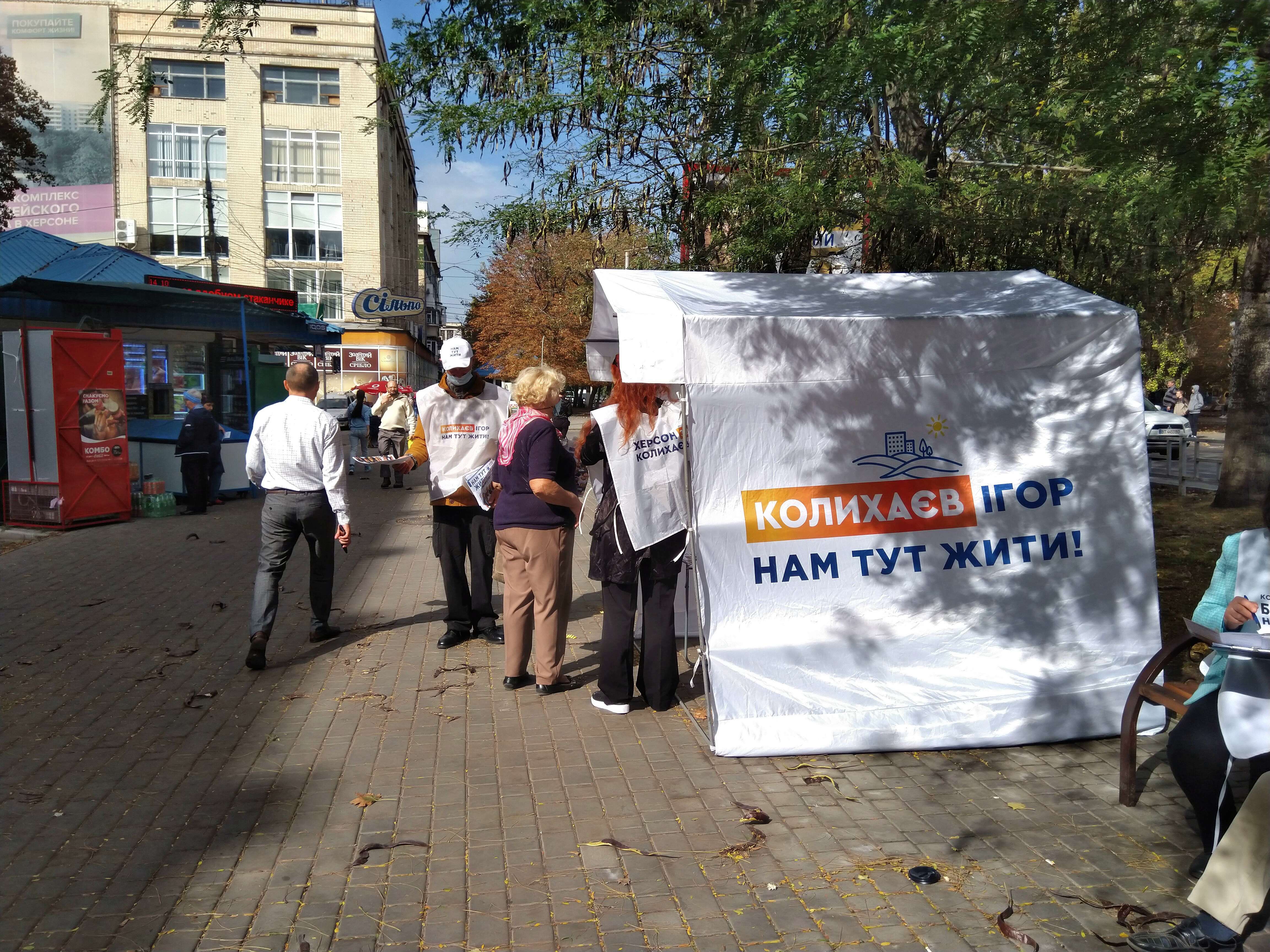 У наметі «Партії Ігоря Колихаєва «Нам тут жити» агітатори пропонують херсонцям визначити пріоритети для розвитку міста. На аркуші для опитування є 14 варіантів, у яких в основному йдеться про благоустрій міста. Також виборці можуть залишити свій номер телефону та написати ім’я. У окремій графі у респондента питають: «Чи можна Вас вважати прихильником Ігоря Колихаєва?»