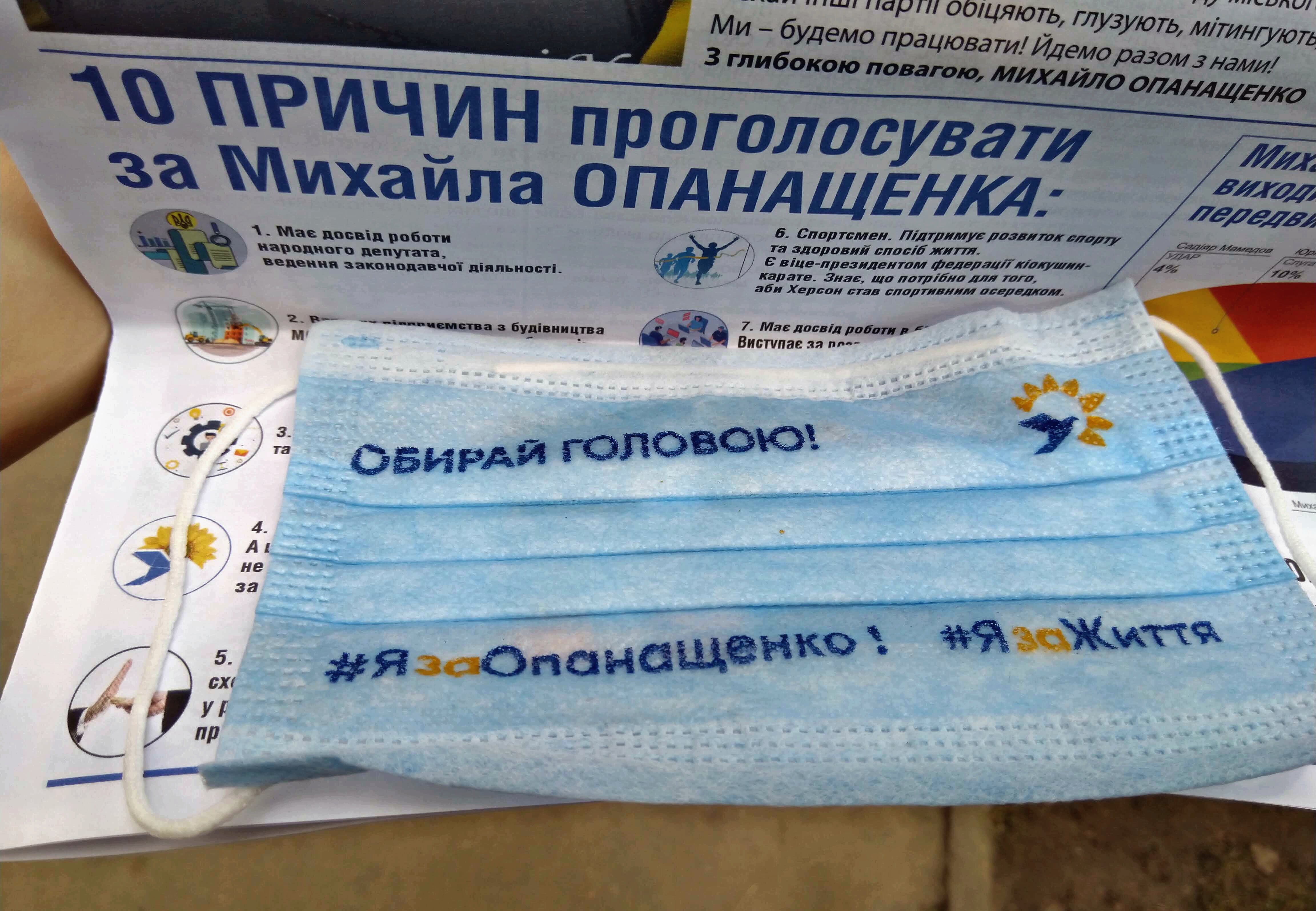 У наметі «Опозиційної платформи – За життя» агітатори разом із друкованою агітацією роздавали медичні маски з партійною символікою. Також на масках були написи: «Обирай головою!», «#ЯзаОпанащенко!» та «#Язамайбутнє». Нагадаємо, що Михайло Опанащенко балотується на посаду міського голови Херсона від «Опозиційної платформи – За життя».
