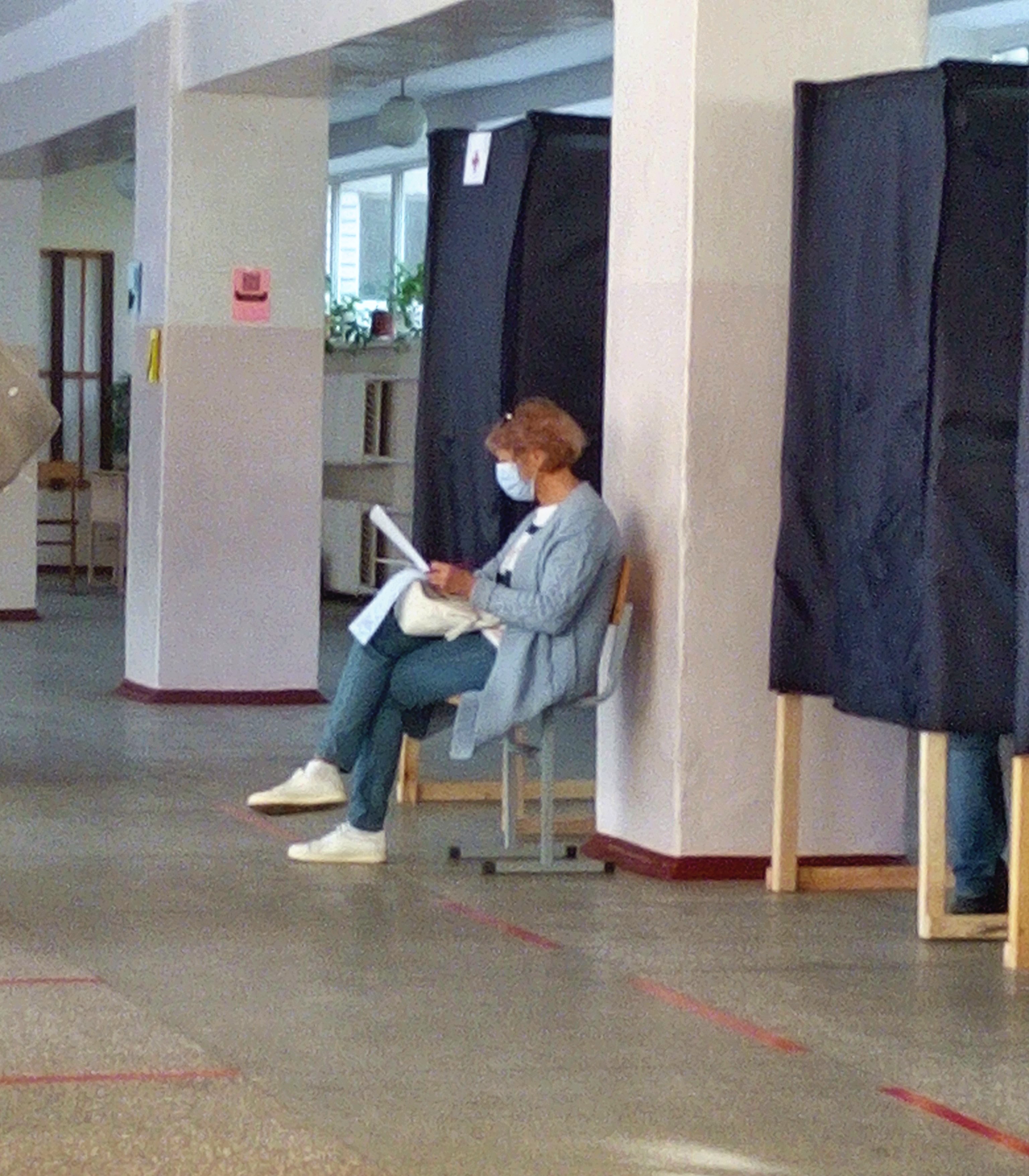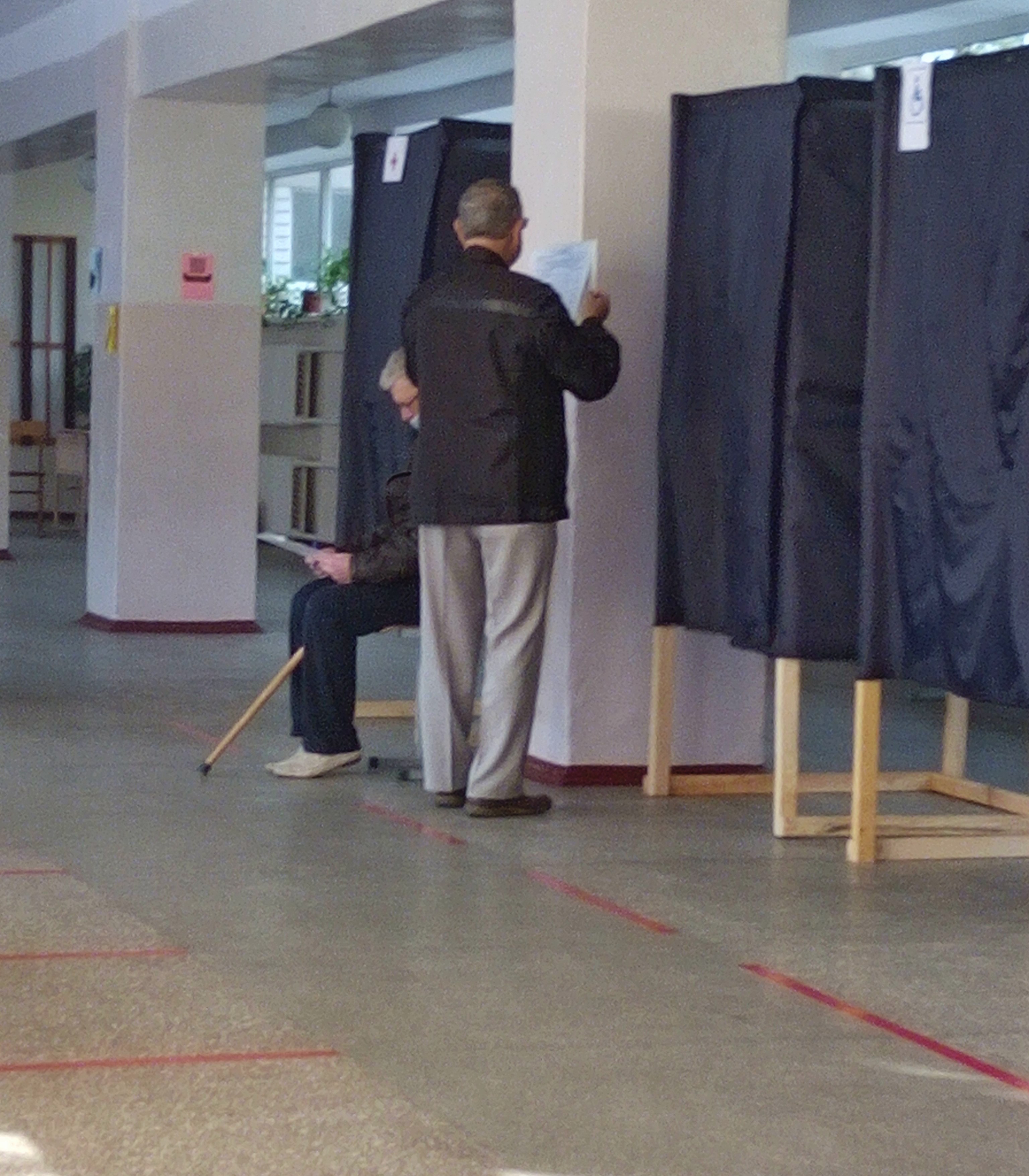 Однак ситуація сталася повторно з іншим виборцем. Голова ДВК пояснила, що у кабінках для голосування погане освітлення, тому виборці вивчають бюлетені зовні. Після зауваження порушення було усунено.