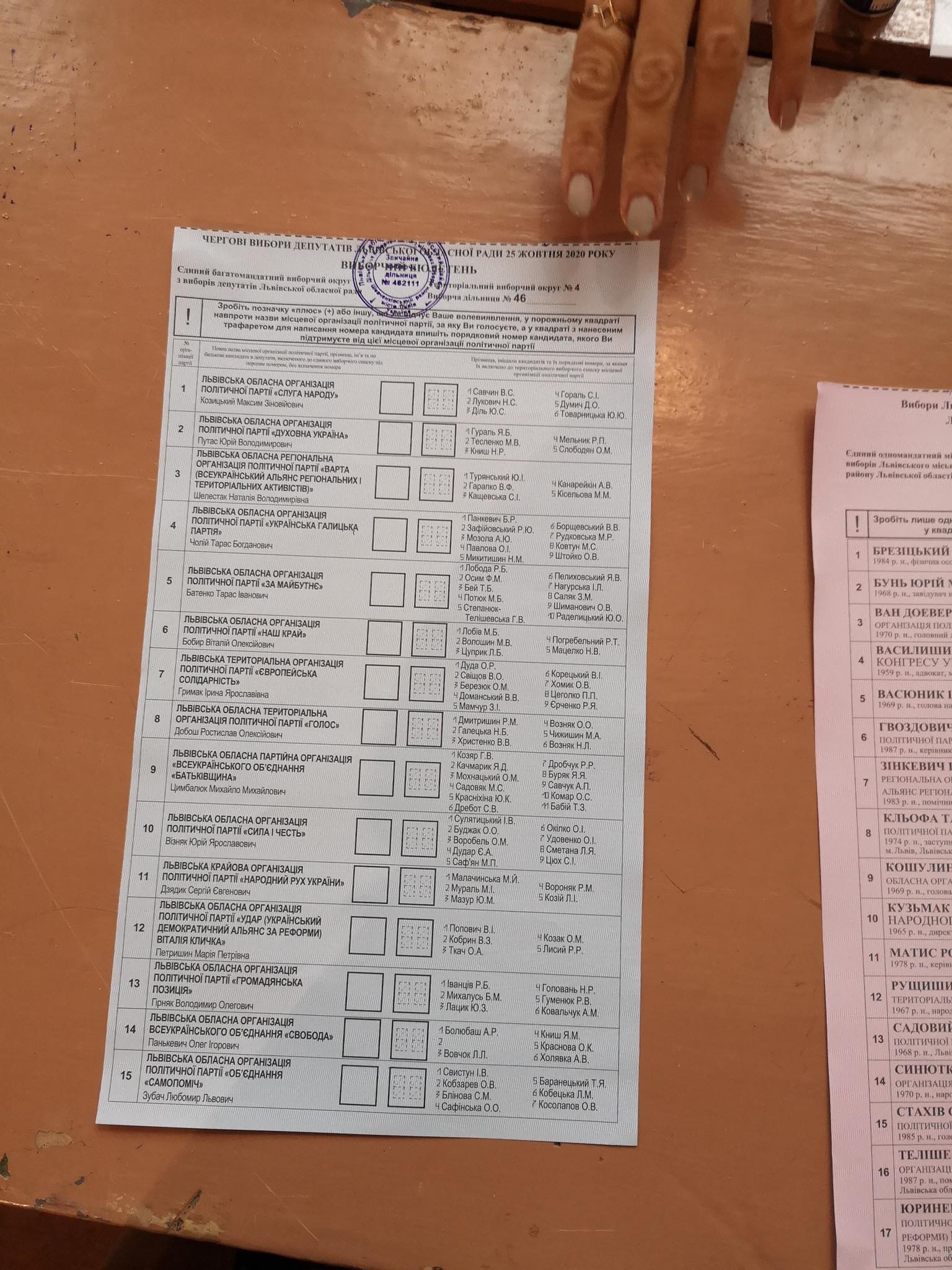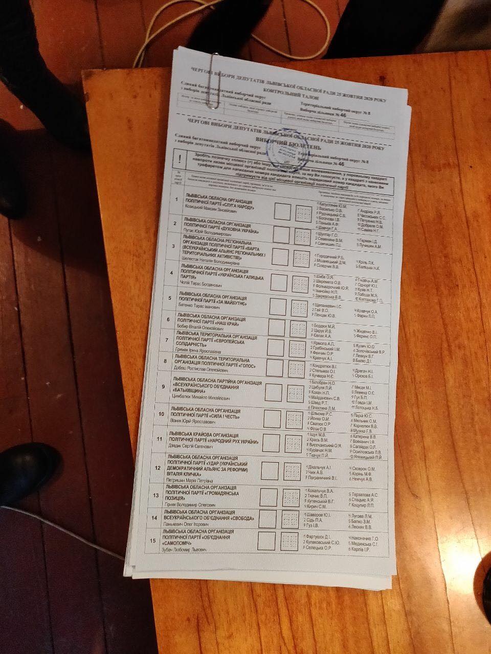 Аналогічна ситуація і в ДВК №462111. На бюлетенях з виборів депутатів до Львівської обласної ради відсутні номери дільниці. Щодо виявленого факту спостерігачка ОПОРИ зробила зауваження членам і голові комісії.