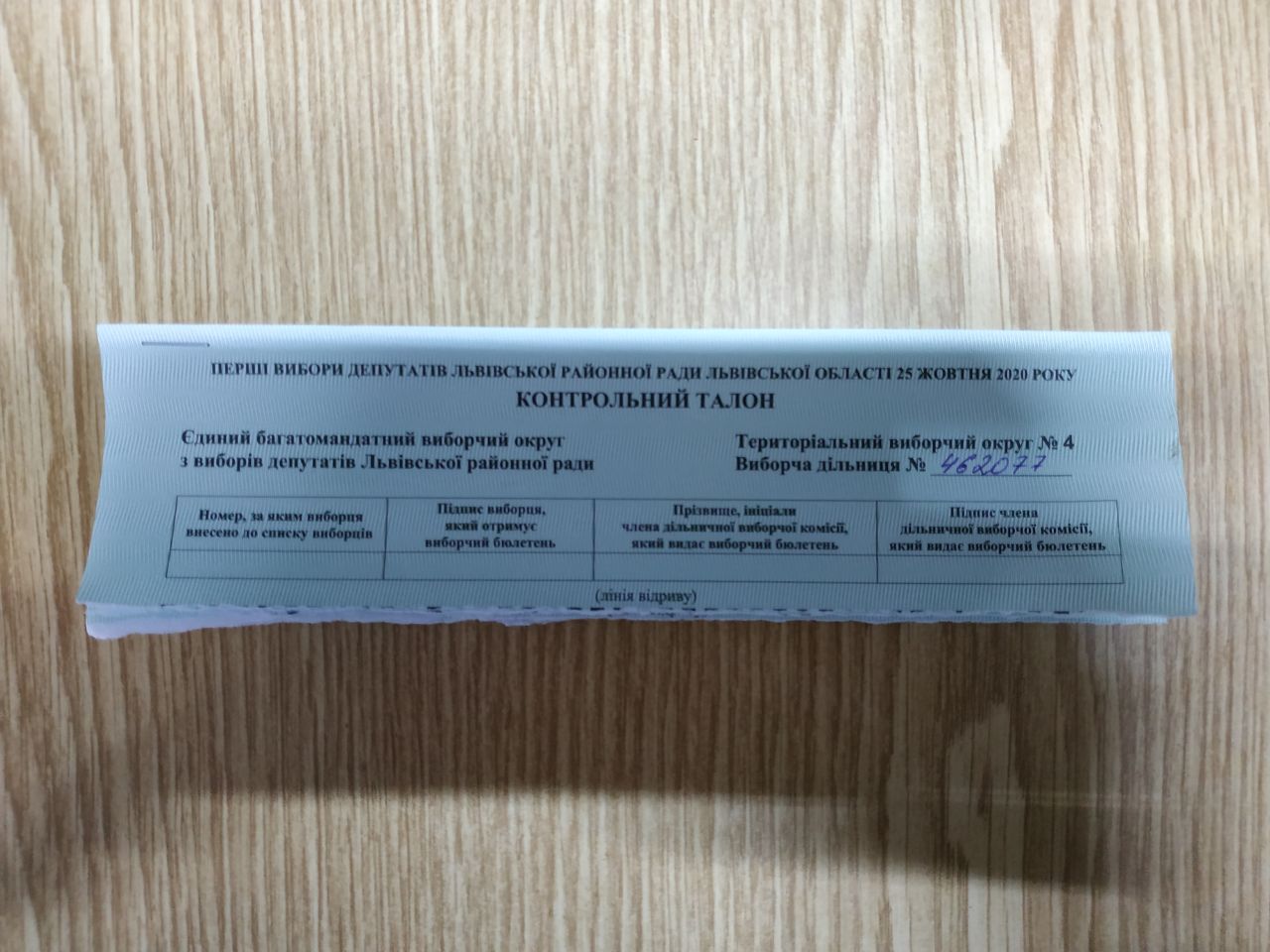 Члени ДВК №462077 (місто Львів) видають виборцям бюлетені, не зазначаючи при цьому у контрольних талонах жодної інформації. А саме – відсутній номер, за яким виборця внесено до списку виборців, підпис виборця, підпис члена комісії. А це є порушення частини 3 статті 249 Виборчого кодексу Під час проведення голосування на виборчій дільниці два члени дільничної виборчої комісії надають виборцю можливість проголосувати: один член дільничної виборчої комісії після пред’явлення виборцем одного з документів, зазначених у пунктах 1, 2 частини першої статті 8 цього Кодексу, за умови наявності виборця у списку виборців на відповідній виборчій дільниці та наявності у нього права голосу на відповідних місцевих виборах (враховуючи відмітку в графі "Примітка" щодо постійної нездатності пересуватися самостійно або запису "Голосує за місцем перебування") надає виборцю список виборців для підпису; другий член дільничної виборчої комісії у позначеному місці на контрольному талоні виборчого бюлетеня вписує своє прізвище, ініціали, ставить підпис та проставляє номер, за яким виборця внесено до списку виборців на дільниці. Виборець ставить підпис за отримання виборчих бюлетенів для голосування на місцевих виборах у списку виборців та на визначеному місці на контрольному талоні кожного виборчого бюлетеня. Після цього член виборчої комісії відокремлює від кожного виборчого бюлетеня контрольний талон та видає виборцю виборчий бюлетень. Член виборчої комісії повідомляє виборцю, скільки виборчих бюлетенів він отримав. Контрольні талони виборчих бюлетенів зберігаються у члена комісії, який видав виборчі бюлетені. При цьому робити на виборчих бюлетенях будь-які інші позначки забороняється.