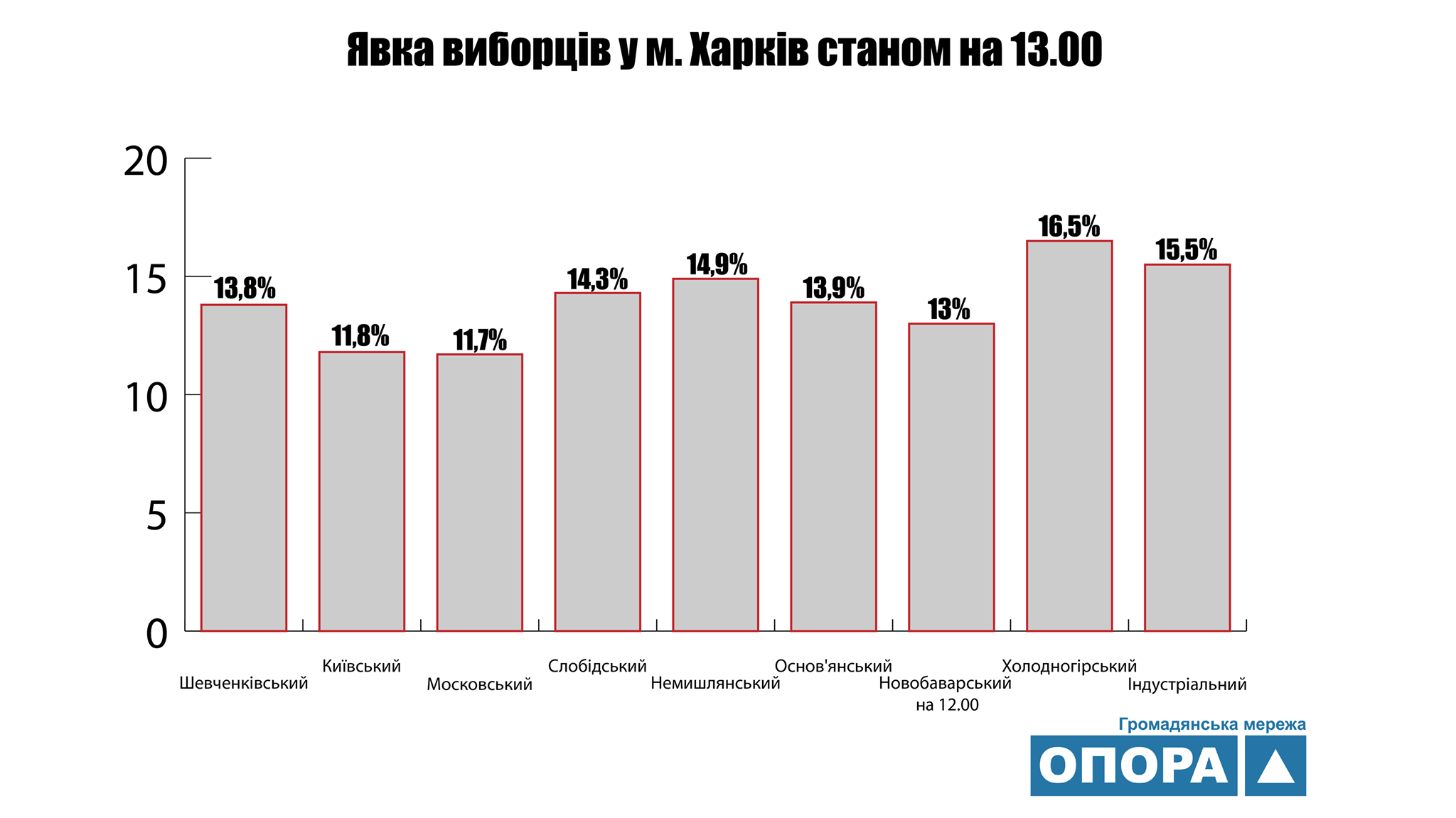 Спостерігачі ОПОРИ отримали інформацію про явку виборців від районних територіальних виборчих комісій у місті Харкові станом на 13 годину.
