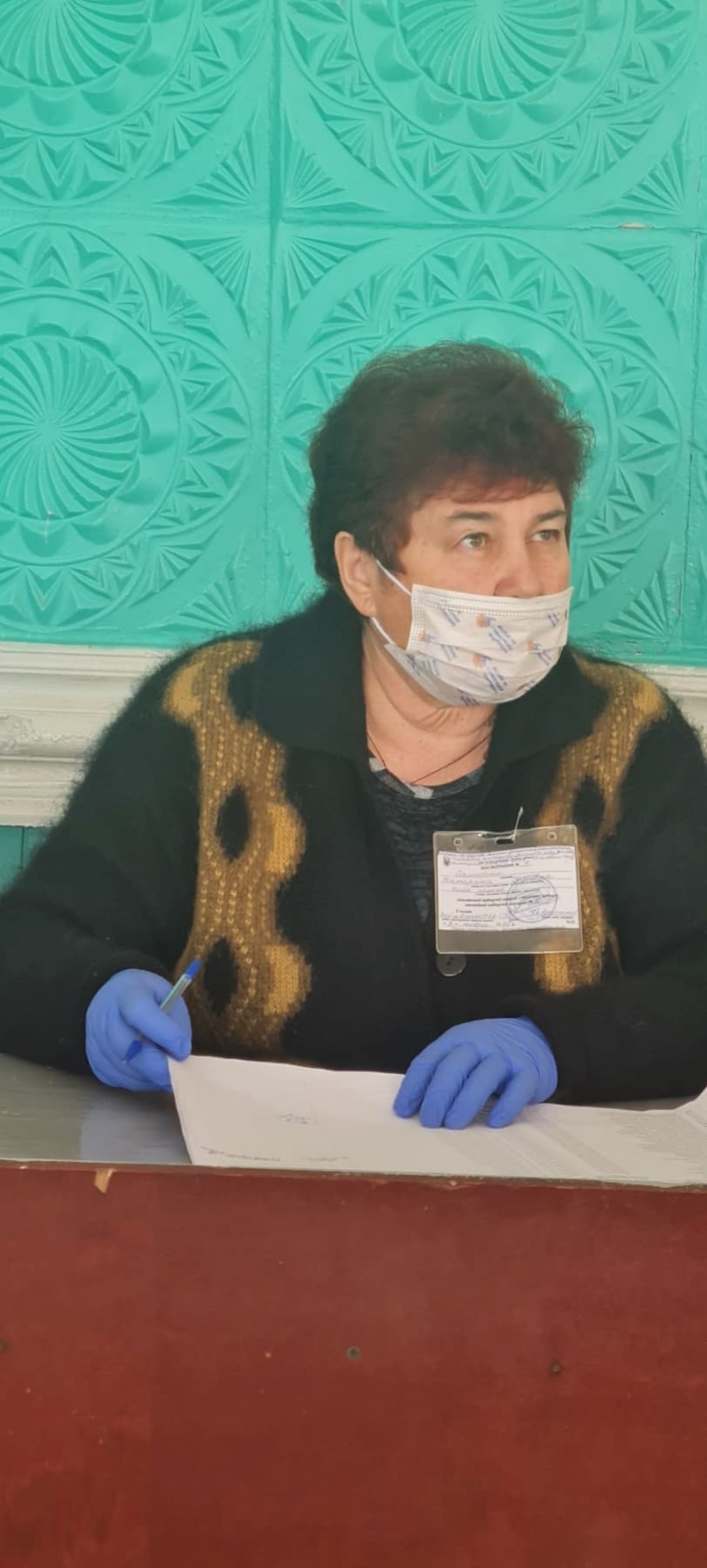 На масці членкині комісії написано «Опозиційна платформа – За життя», також присутній логотип цієї політичної сили.