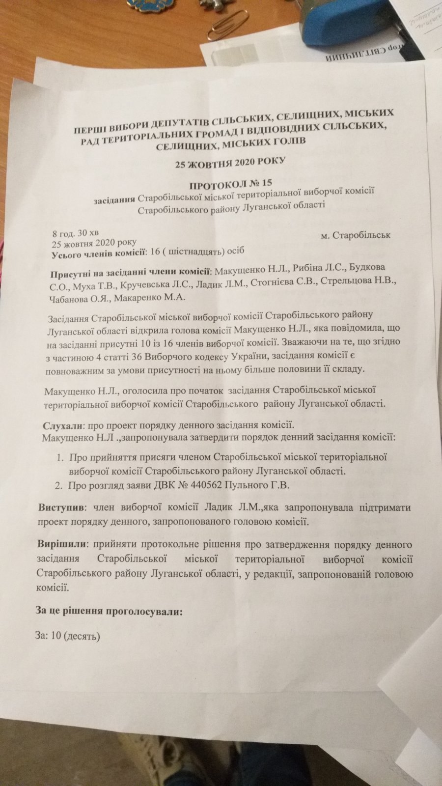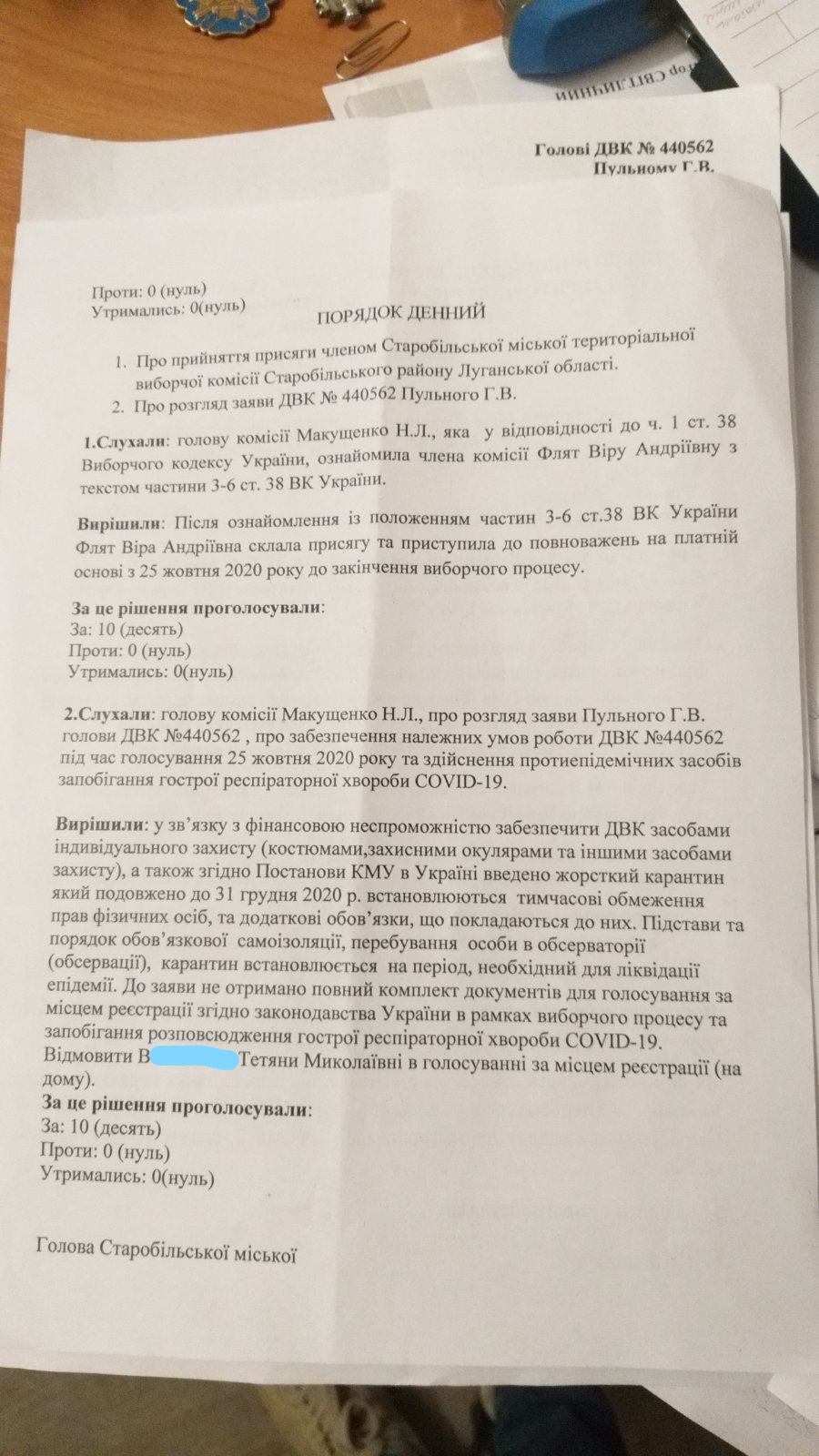 Ще один подібний випадок був зафіксований спостерігачем ОПОРИ у Старобільску. Міська ТВК відмовила виборцю Тетяні В. на ії заяву щодо голосування на дому у зв’язку із захворюванням на коронавірус. Комісія відмовила жінці протоколом № 15 від 25 жовтня 2020 року у такому формулюванні «у зв’язку з фінансовою неспроможністю забезпечити ДВК засобами індивідуального захисту (костюмами, захисними окулярами та іншими засобами індивідуального захисту), а також згідно Постанови КМУ в Україні введено жорсткий карантин, який подовжено до 31 грудня 2020 року встановлюються тимчасові обмеження прав фізичних осіб та додаткові обов’язки, що покладаються на них. Підстави та порядок обов’язкової самоізоляції, перебування особи в обсерваторії (обсервації), карантин встановлюється на період, необхідний для ліквідації епідемії. До заяви не отримано повний комплект документів для голосування за місцем реєстрації згідно законодавства України в рамках виборчого процесу та запобігання розповсюдженню гострої респіраторної хвороби COVID-19».