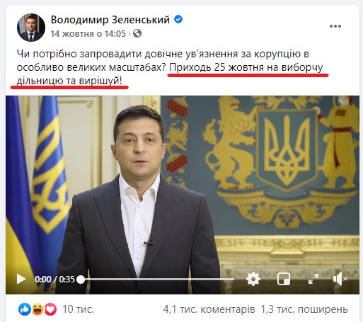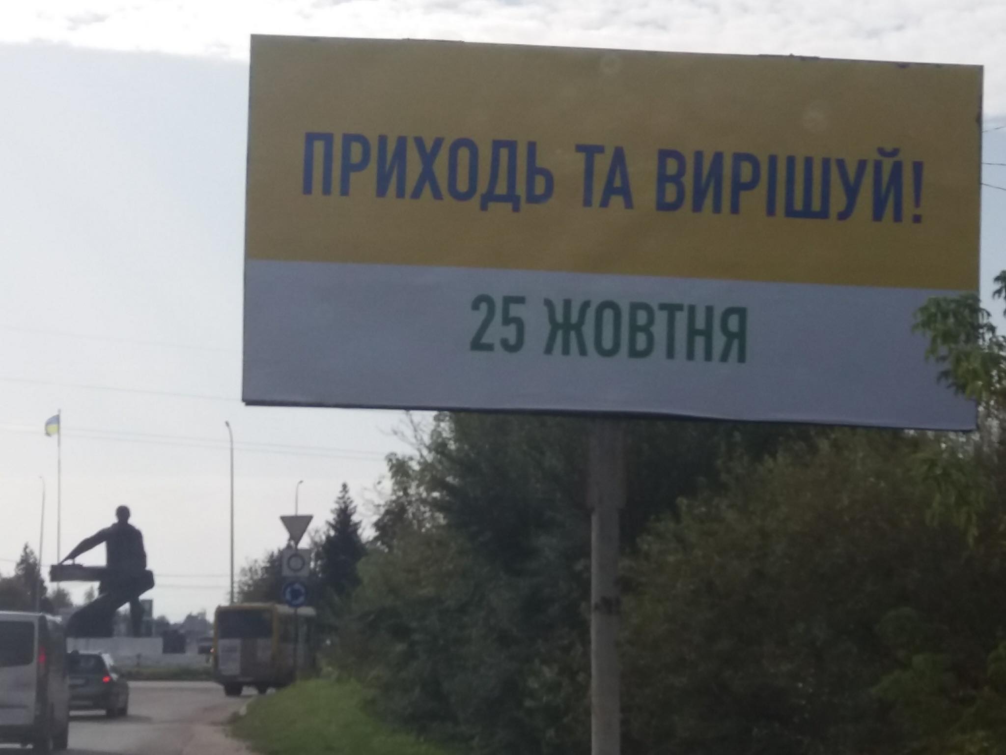 “Приходь та вирішуй! 25 жовтня” - білборди з таким текстом ОПОРА зафіксувала у містах Дрогобич, Новояворівськ, Червоноград. Схожий текст публікували у дописах до відеозвернень президента України Володимира Зеленського. У них Зеленський презентував 5 запитань, на які запропонував відповісти українцям у день волевиявлення.