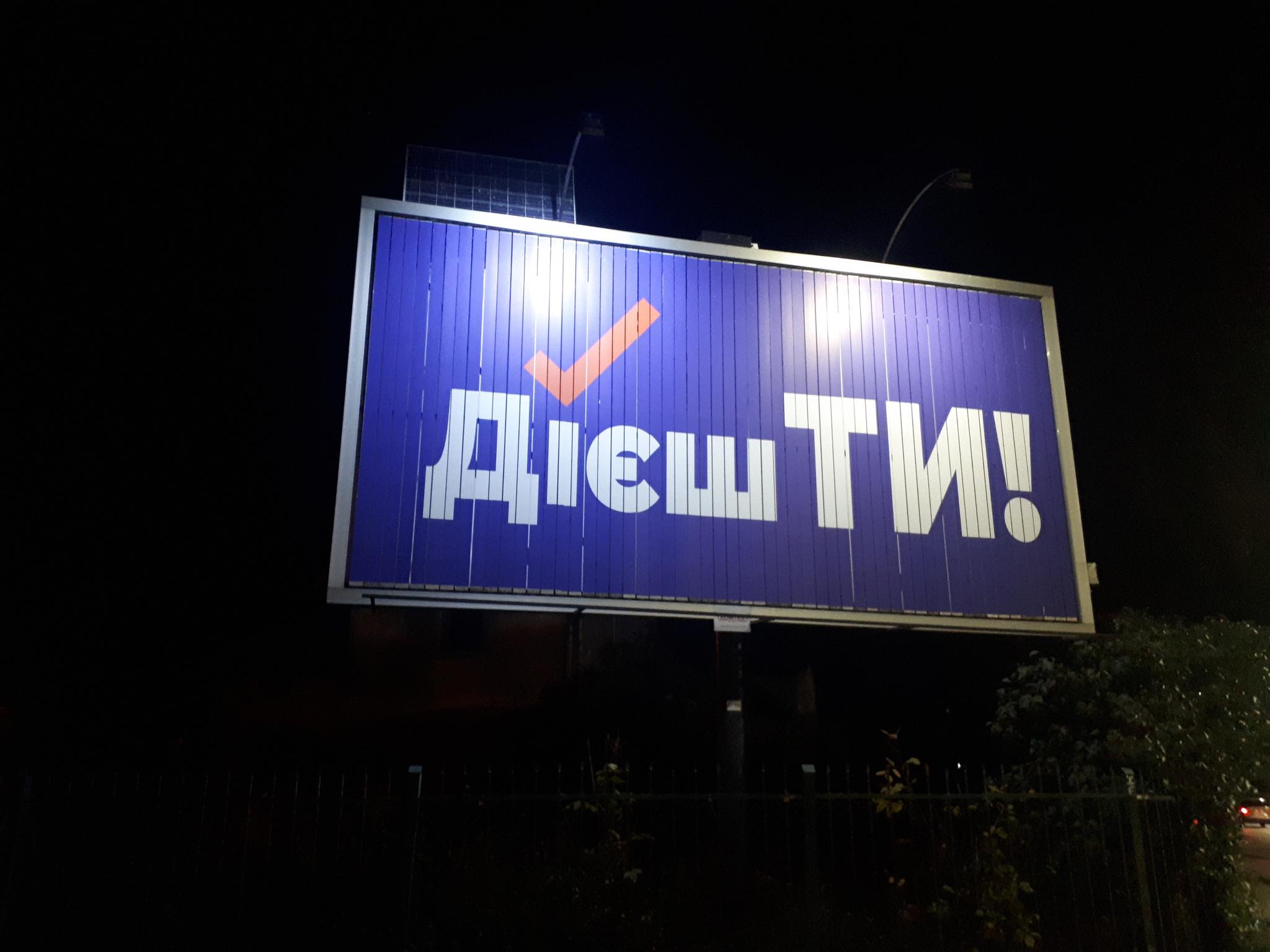 Рекламні борди без вихідних даних з текстом “Дієш ти!” і зображенням знаку, який потрібно ставити у бюлетені або без нього є у Львові та Червонограді. Гасло, кольорова гама може асоціюватися у виборців із політичною партією “Варта”. На сторінці політичної сили у соціальній мережі можна знайти ролик із аналогічною заставкою.
