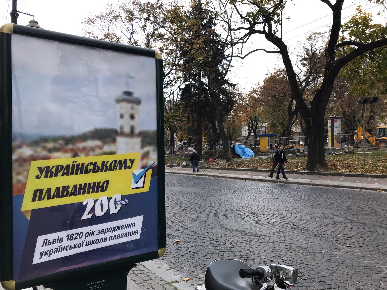 Також у Львові є сітілайти, білборди з текстом “Українському плаванню 200 років. Львів 1820 рік зародження української школи плавання”. Ця зовнішня реклама за своєю кольоровою гамою, символами може асоціюватися у виборців з агітаційними матеріалами кандидата на посаду міського голови Львова від ВО “Свобода” Руслана Кошулинського.