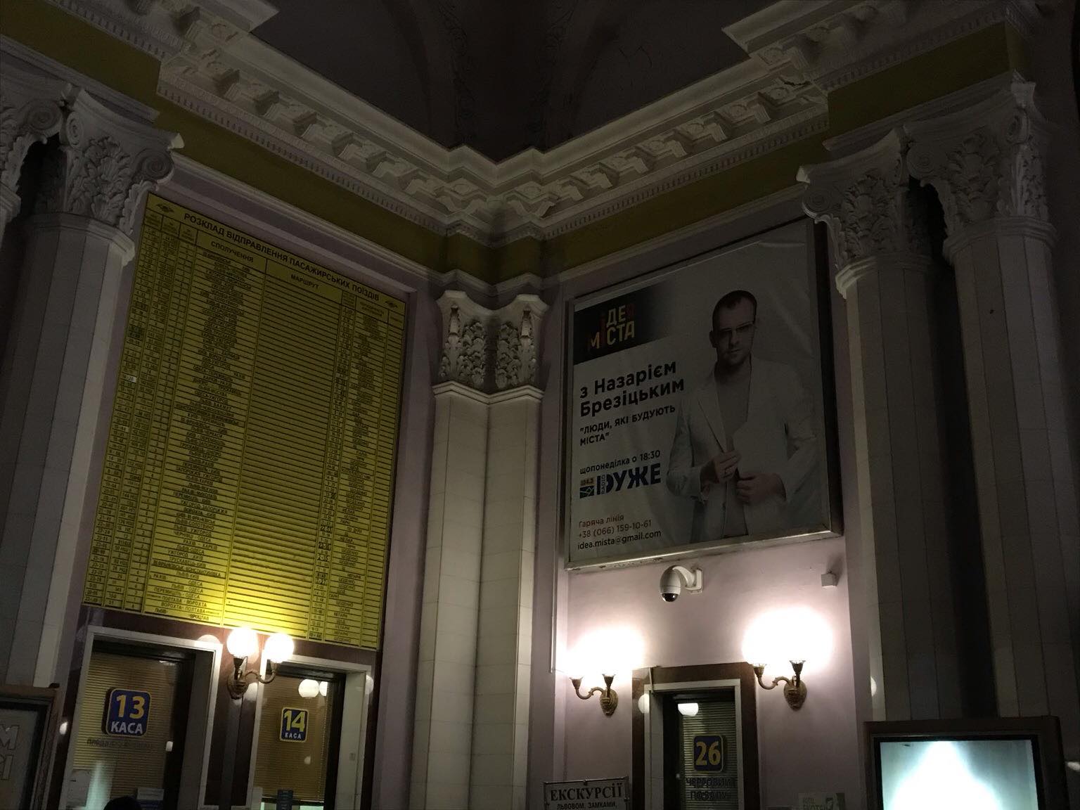 У приміщенні залізничного вокзалу у місті Львові висить банер із соціальною рекламою авторської радіопрограми Назарія Брезіцького та його світлиною. Брезіцький кандидує на посаду міського голови Львова (самовисування).
