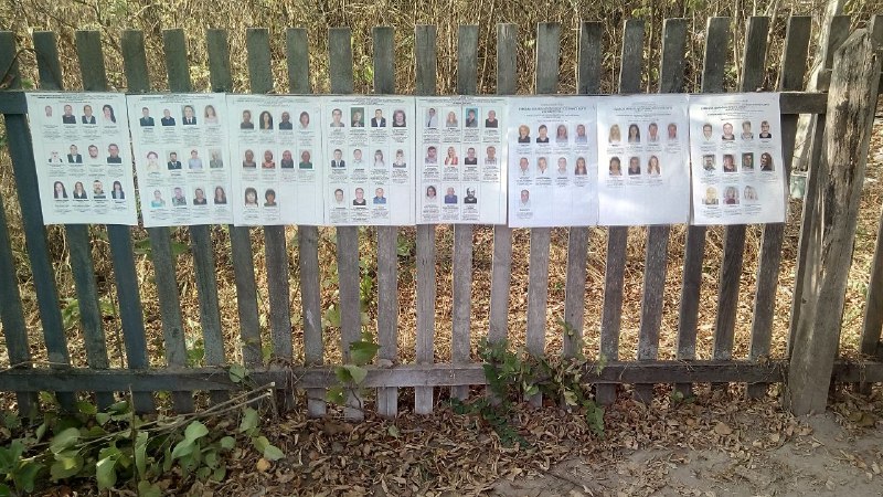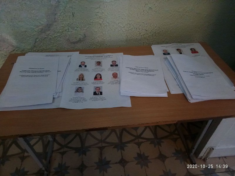 На окремих виборчих дільницях виникли проблеми із розміщенням інформаційних плакатів. Тому ту частину плакатів, для яких не знайшлось місця на стендах чи стінах виборчої дільниці, розташували стопкою на столі (виборча дільниця № 590975, м. Суми) або на паркані поблизу виборчої дільниці (ВД № 590427, с. Климентове)
