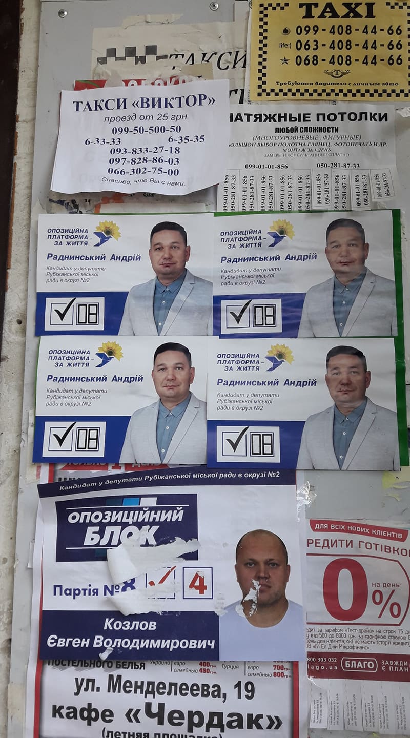 Так, спостерігач ОПОРИ у Рубіжному зафіксувала листівки на під’їздах будинку за адресою вулиця Володимирська 34, на яких зображений кандидат від ОПЗЖ Андрій Раднинський та його номер у виборчому бюлетені - № 8.