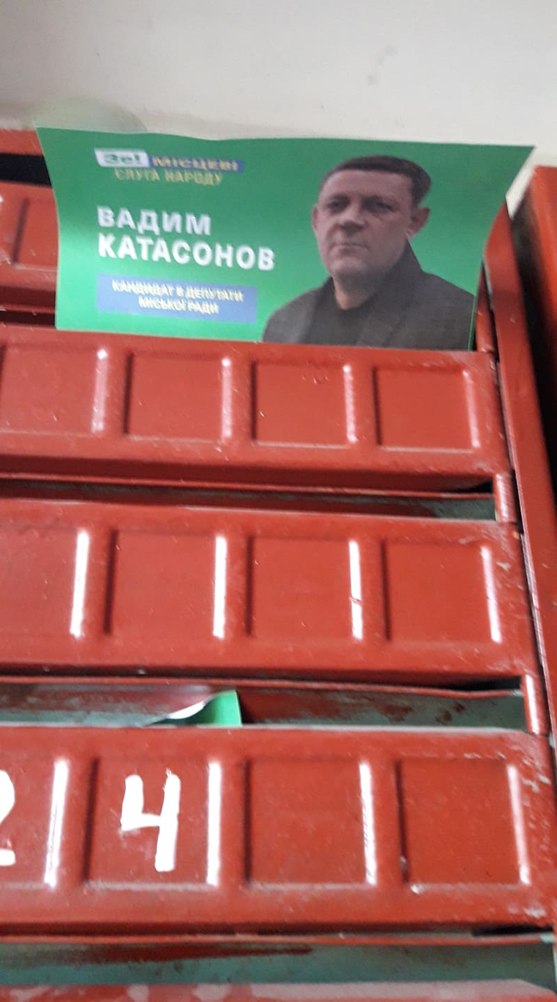 Поряд із цим, за адресами Володимирська 34, Менделєєва 21 у поштових скриньках виявлено листівки кандидатів від партії «Слуга народу» Вадима Катасонова та Максима Бурлакова.