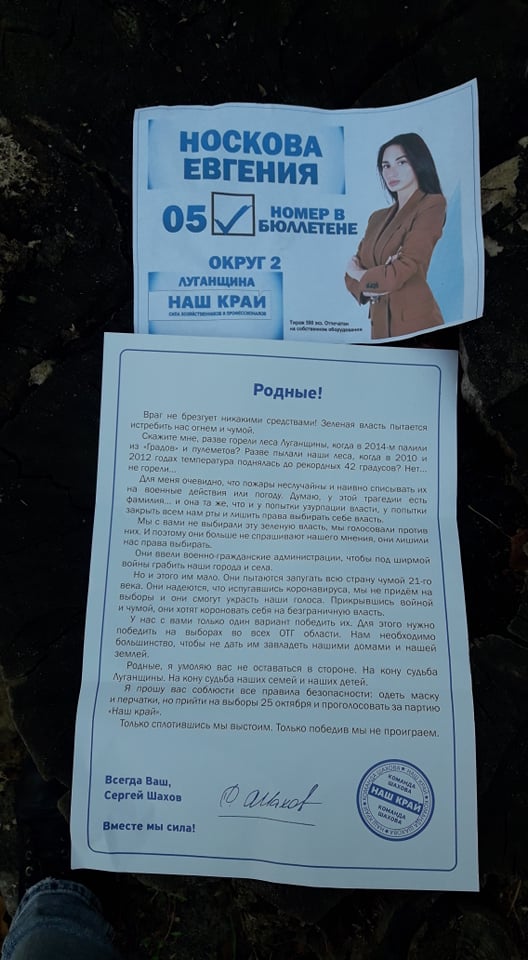 Поряд із цим, виявлені також листівки від партії «Наш край» із зображенням кандидата в депутати Носкової Євгенії та листом-зверненням до виборців за підписом Сергія Шахова.