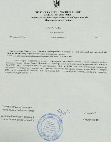 У селищі Нікольське (Маріупольський район) 27 жовтня о 17:30 ТВК розглянула скаргу кандидата на посаду Нікольського селищного голови Василя Мітька і прийняла постанову №27 щодо перевірки виборчої документації ДВК №140218 для унеможливлення порушення виборчого законодавства внаслідок.