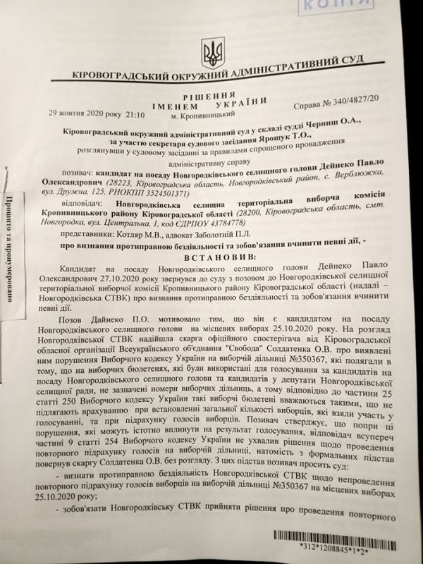 Як зазначено у справі, на розгляд Новгородківської селищної ТВК надійшла скарга офіційного спостерігача ВО «Свобода» Солдатенка О. В. про виявлені ним порушення Виборчого кодексу України на виборчій дільниці № 350367, які полягали в тому, що на виборчих бюлетенях, які були використані для голосування за кандидатів на посаду Новгородківського селищного голови та кандидатів у депутати Новгородківської селищної ради, не зазначені номери виборчих дільниць.