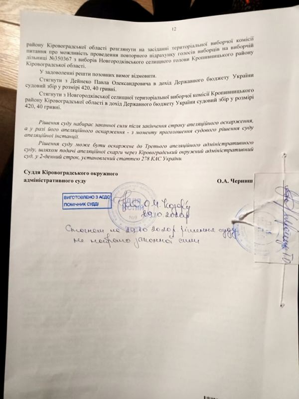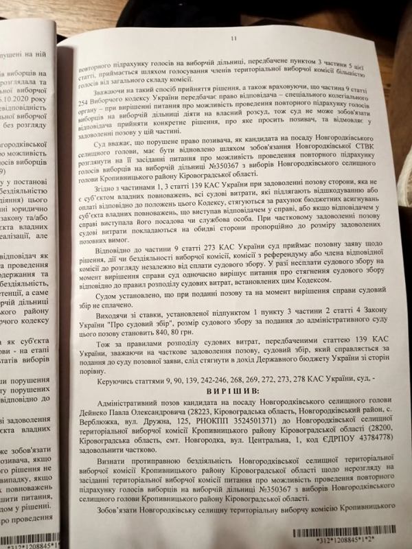 «Визнати протиправною бездіяльність Новогородківської селищної ТВК щодо не розгляду на засіданні ТВК питання про можливість проведення повторного підрахунку голосів виборців на виборчій дільниці № 350367 з виборів Новгородківського селищної голови. Зобов’язати Новогородківську селищну ТВК розглянути на засіданні ТВК питання про можливість проведення повторного підрахунку голосів виборців на виборчій дільниці №350367 з виборів Новогородківськогоселищного голови», – йдеться в ухвалі суду.