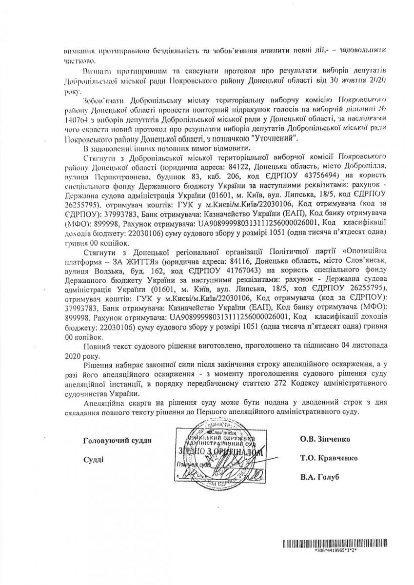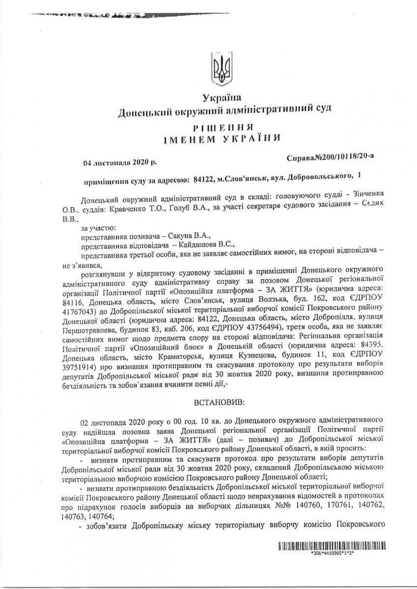 Представники осередку політичної партії «Опозиційна платформа — За життя» звернулись до суду. Вони вимагали визнати протиправним та скасувати протокол Добропільської міської ТВК про результати виборів депутатів до міської ради від 30 жовтня. 4 листопада Донецький окружний адміністративний суд розглянувши позов у відкритому засіданні та визнав протиправним протокол міської територіальної виборчої комісії від 30 жовтня 2020 року з результатами виборів депутатів, а також зобов’язав провести повторний підрахунок голосів на виборчій дільниці №140764, за наслідком чого скласти новий протокол з позначкою «Уточнений».