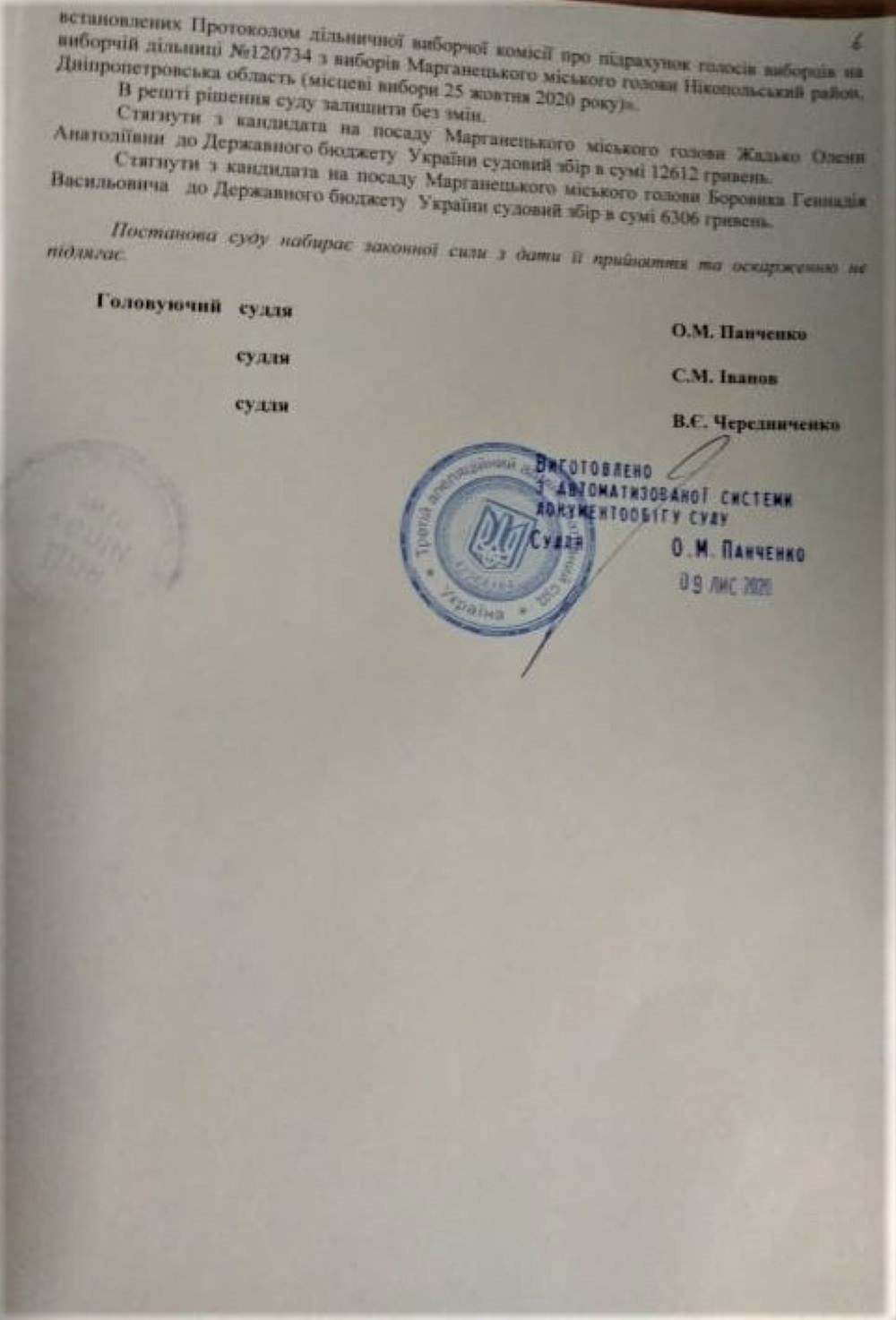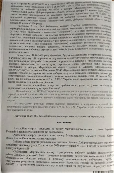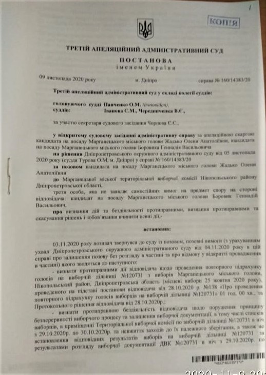 9 листопада Третій апеляційний адміністративний суд постановив зобов’язати Марганецьку міську ТВК повторно встановити результати голосування з виборів Марганецького міського голови з урахуванням проведення повторного підрахунку голосів на виборчій дільниці №120731 та результатів підрахунку голосів на ВД №120734.