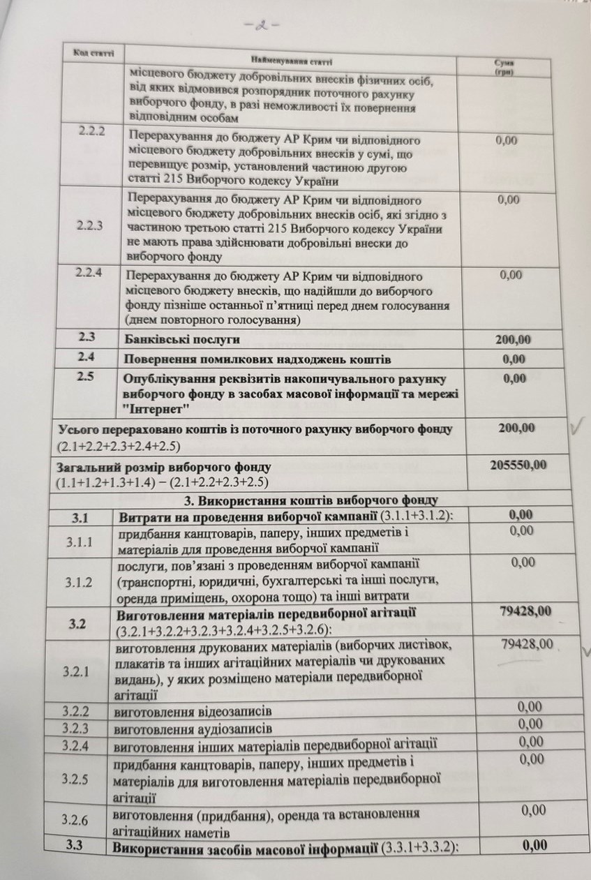 У звіті кандидата зазначено, що в період із 29 вересня по 30 жовтня його виборчий фонд становив 664 115 грн. Із них 59,96% ─ це добровільні внески фізичних осіб, а 40,04% − власні кошти кандидата.