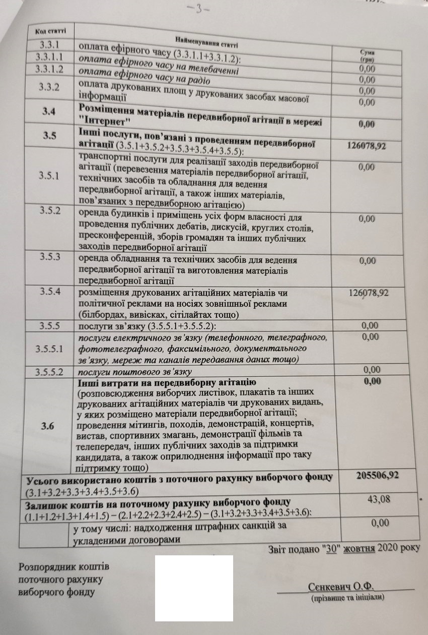Так, на виготовлення матеріалів передвиборної агітації Олександр Сєнкевич витратив 79 428 грн, на розміщення друкованих агітаційних матеріалів на носіях зовнішньої реклами – 126 078,92 грн. На використання ЗМІ та розміщення матеріалів передвиборної агітації в мережі Інтернет кандидат не витратив ні копійки.