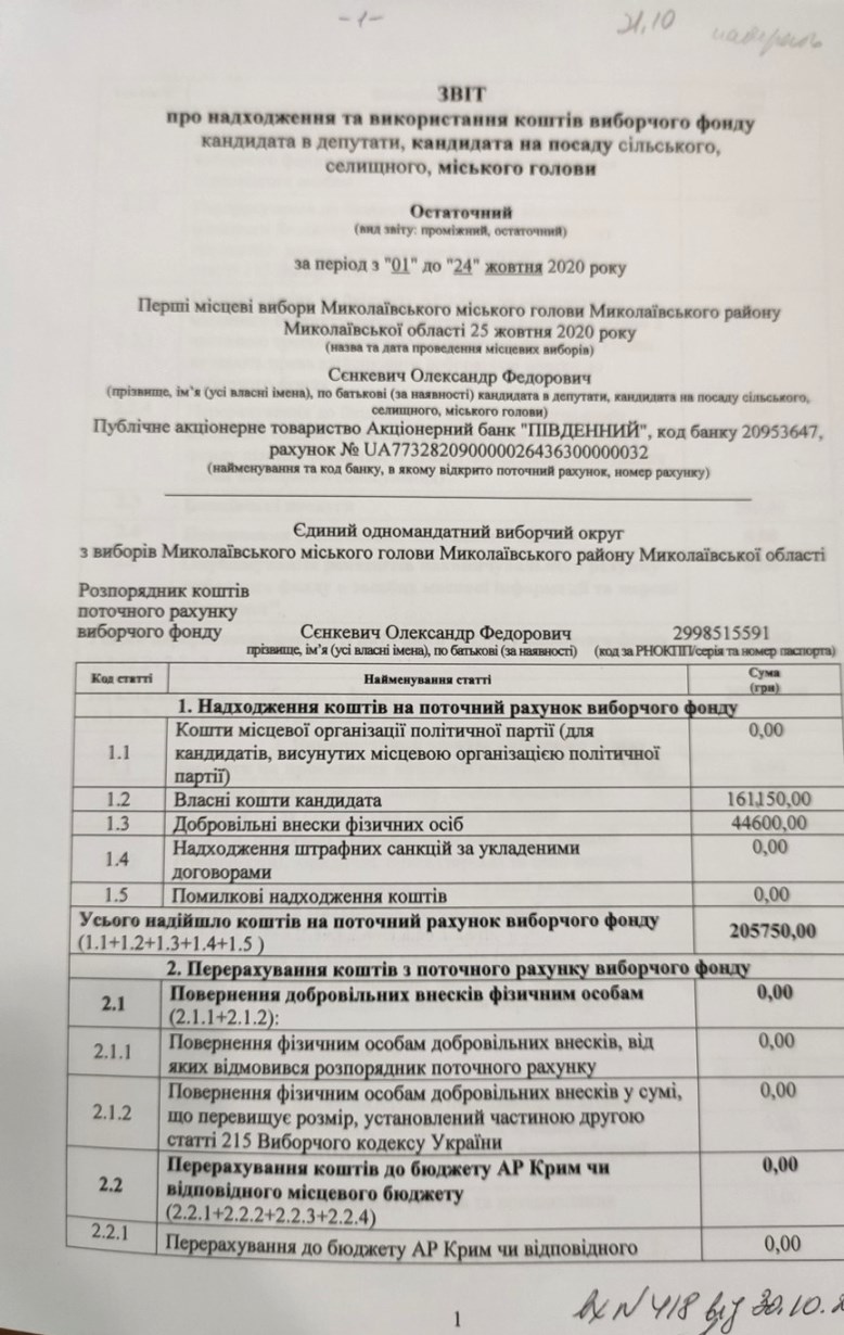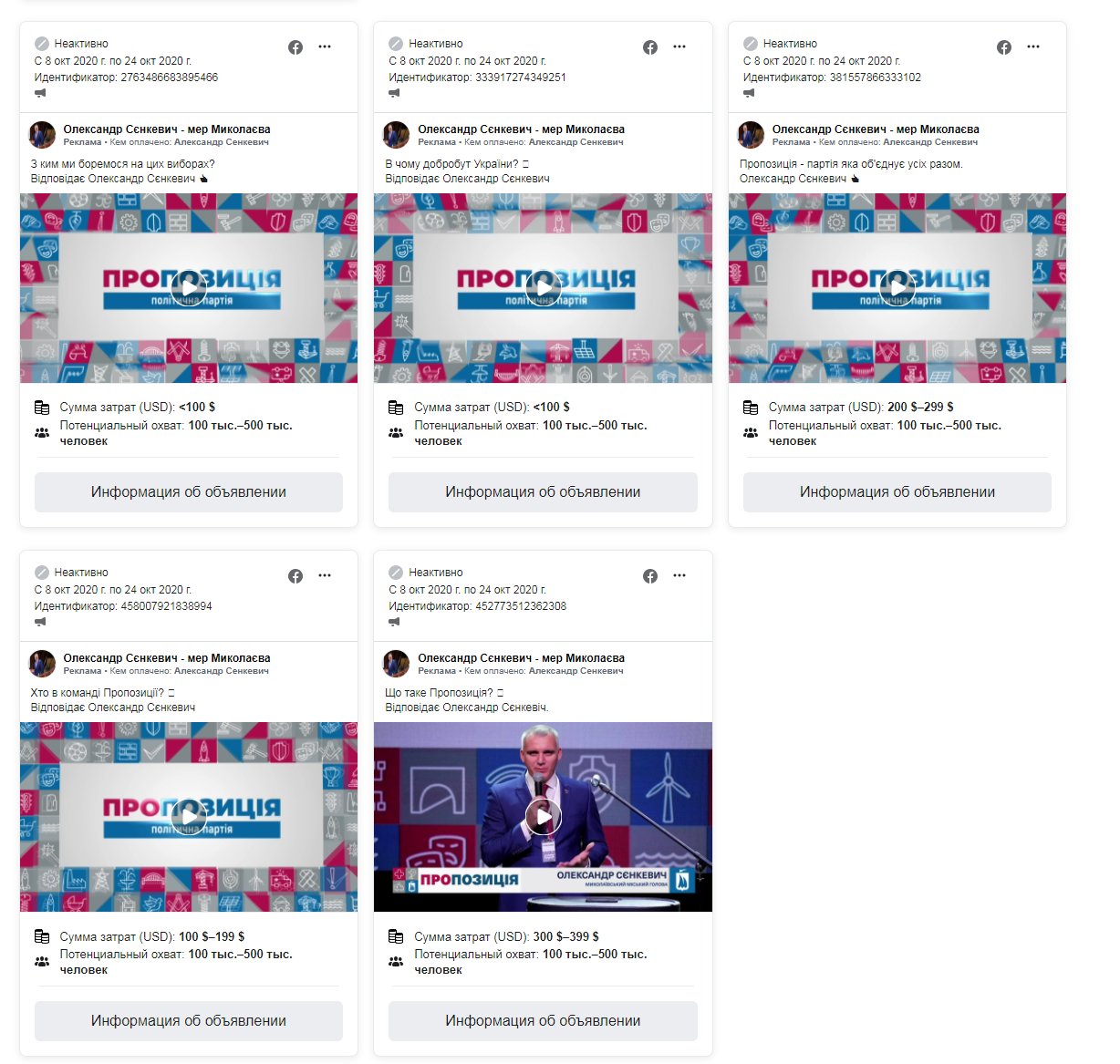 Варто зауважити, що, за даними бібліотеки політичної реклами в Facebook, на сторінці «Олександр Сєнкевич-мер Миколаєва» у період із 1 по 24 жовтня були розміщені кілька оголошень із символікою партії «Пропозиція», від якої балотується кандидат. Оплачені вони Олександром Сєнкевичем.