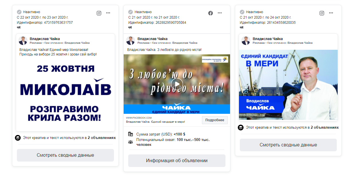 Так, на офіційній сторінці Владислава Чайки в Facebook , за даними бібліотеки політичної реклами, в період із 29 вересня по 30 жовтня були розміщені 53 рекламні оголошення. Оплачені вони Владиславом Чайкою.