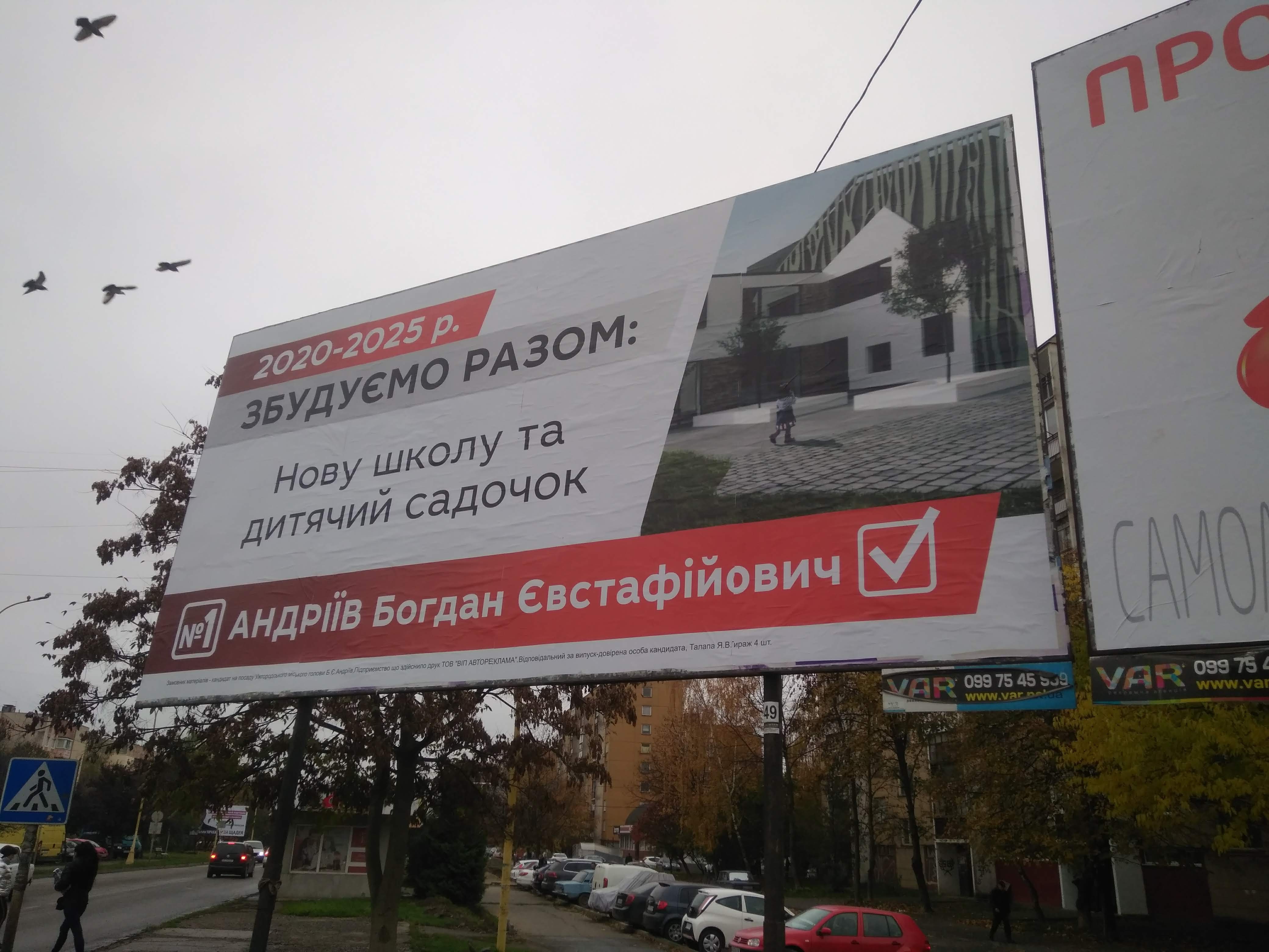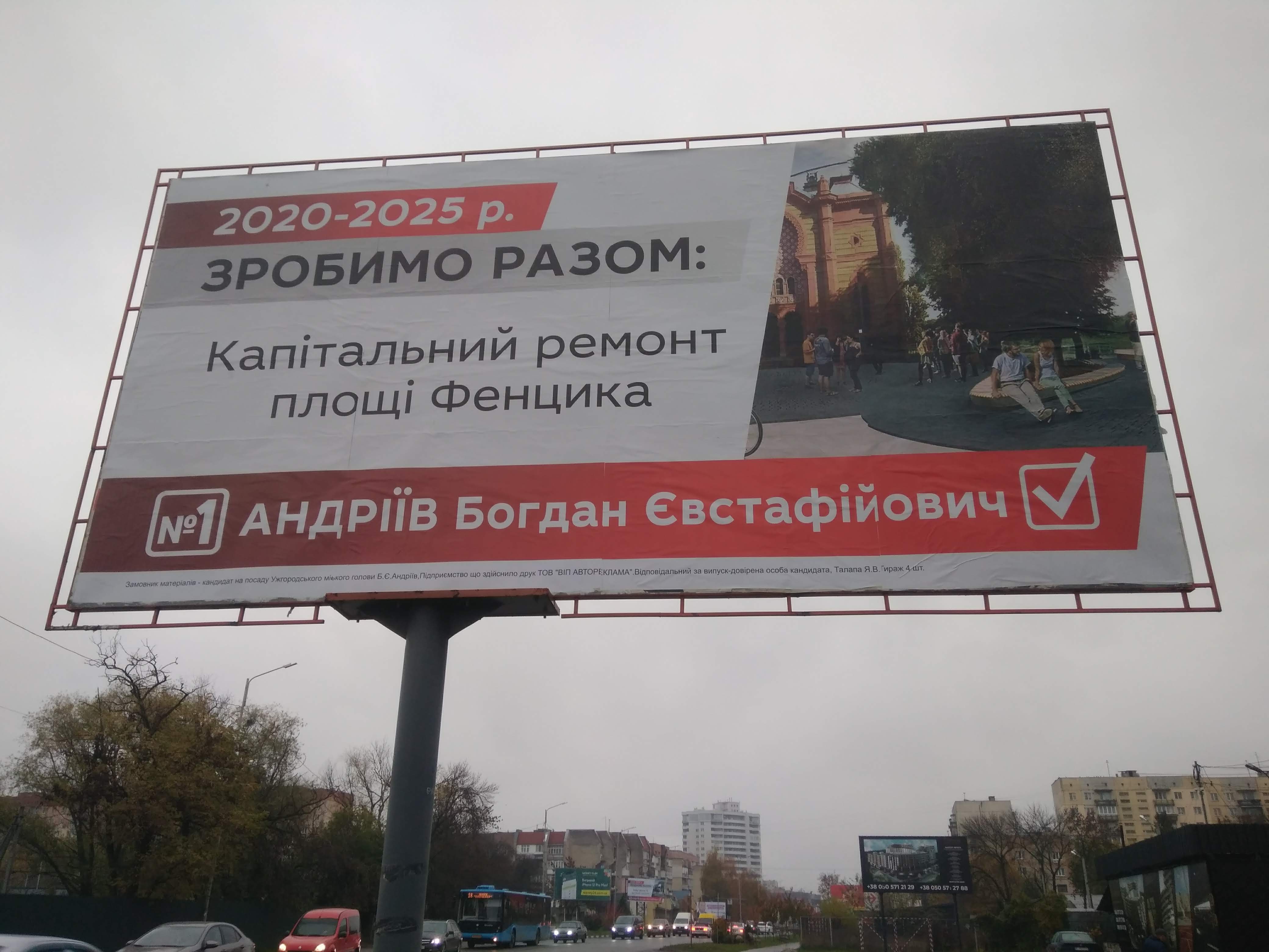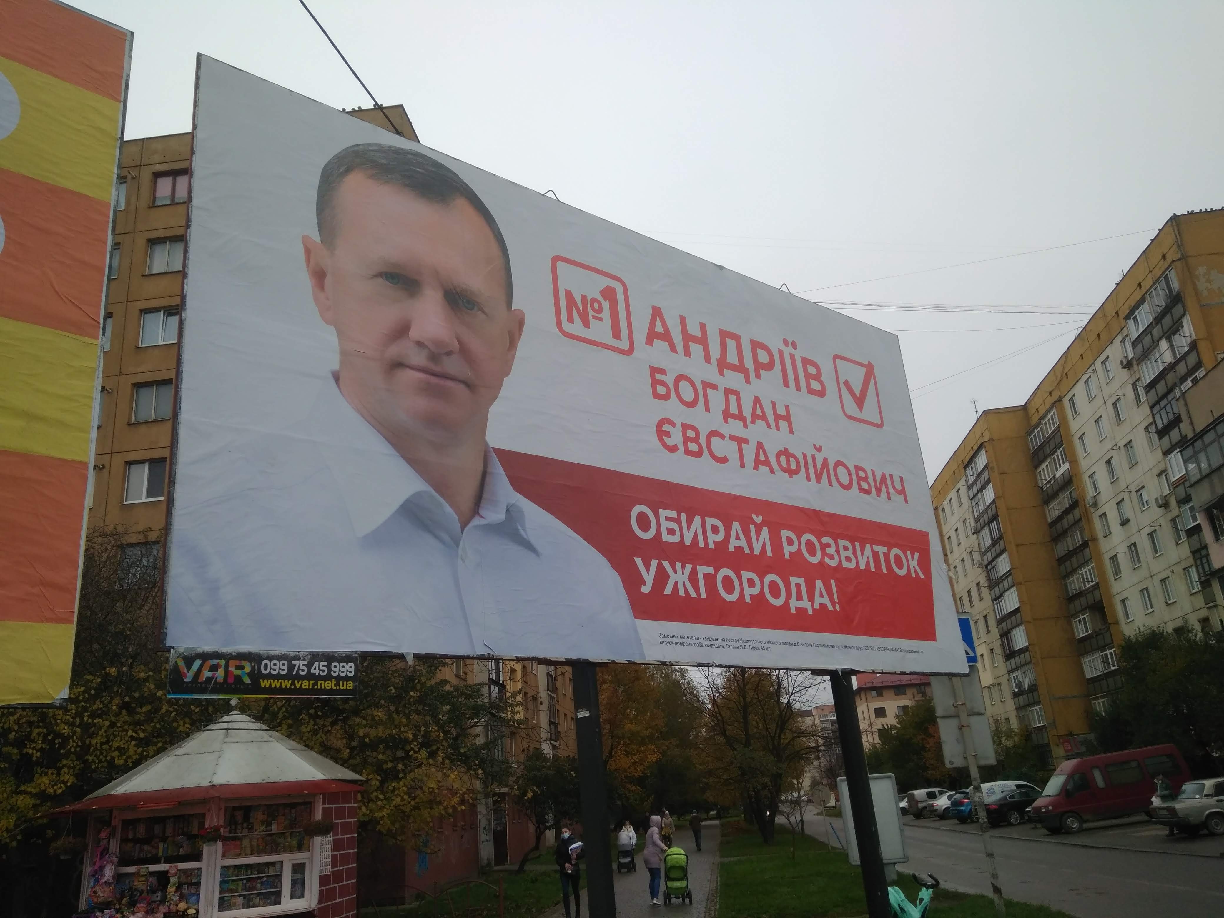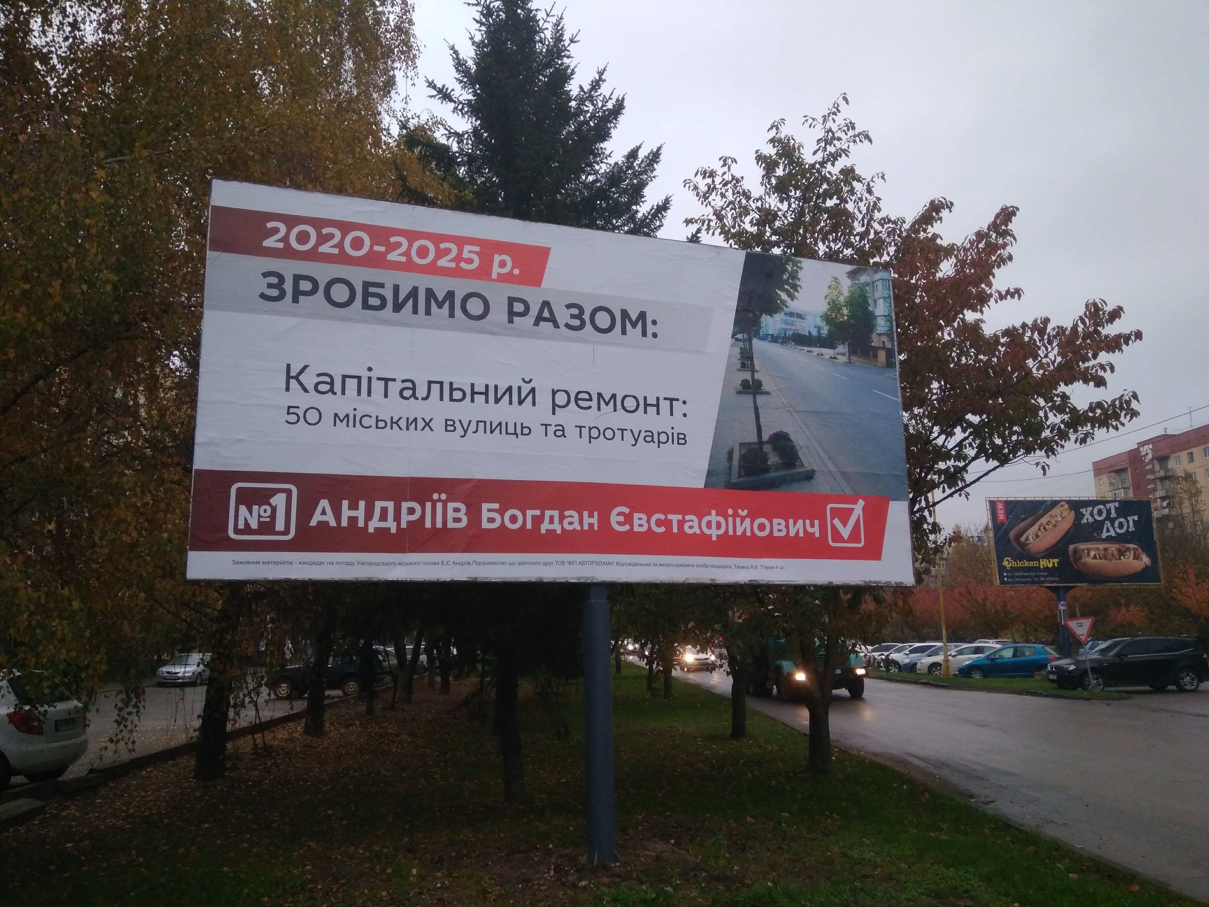 Крім цього, у місті з’явилося чимало бордів із агітацією за чинного міського голову Ужгорода, кандидата-самовисуванця на цю ж посаду Богдана Андріїва. Зокремапла. Є плакат із фотографією Богдана Андріїва та написом: «Андріїв Богдан Євстафійович №1. Обирай розвиток Ужгорода». Згідно з вихідними даними, замовник бордів – кандидат на посаду міського голови Богдан Андріїв. Також з’явилася серія бордів «Зробимо разом» із ймовірними проєктами, які чинний міський голова має наміри втілити в Ужгороді упродовж 2020-2025 років. Зокрема, є борд із написом «Зробимо разом: капітальний ремонт площі Фенцика, Андріїв Богдан Євстафійович, №1», «Зробимо разом: капітальний ремонт площі Театральної», «Збудуємо разом: нову школу та дитячий садочок», «Зробимо разом: капітальний ремонт 50 міських вулиць та тротуарів».