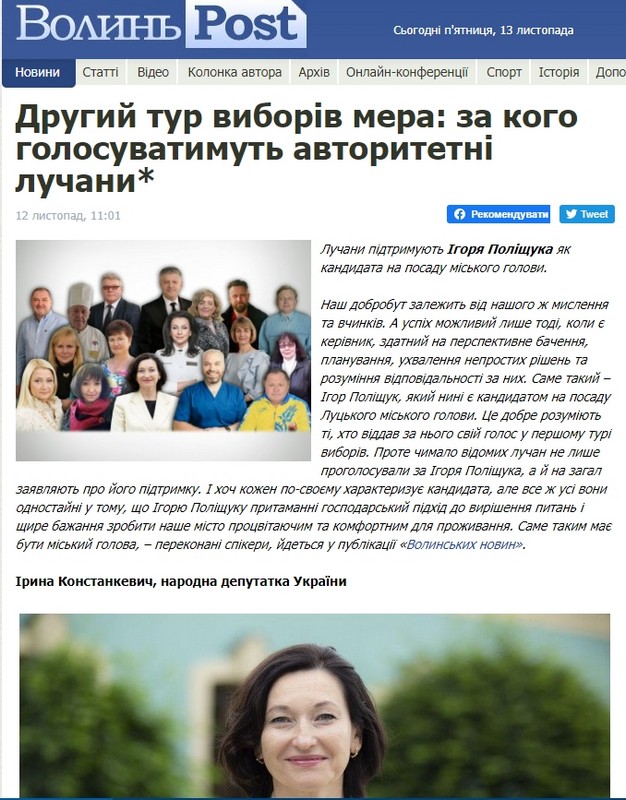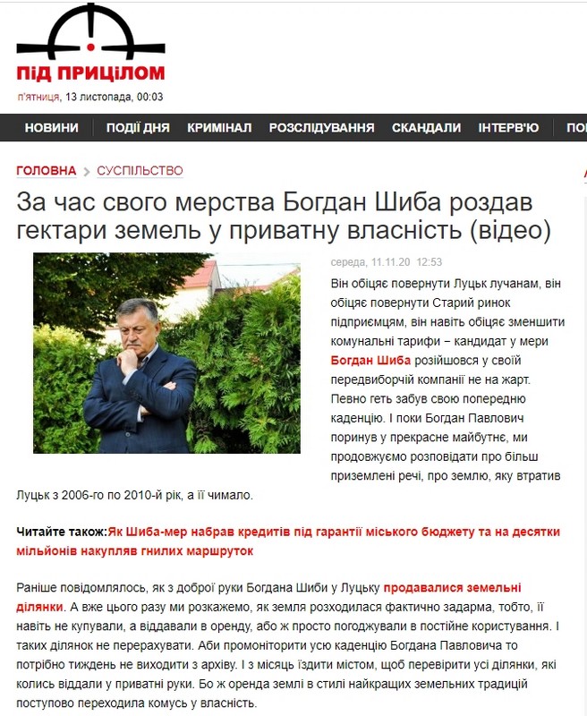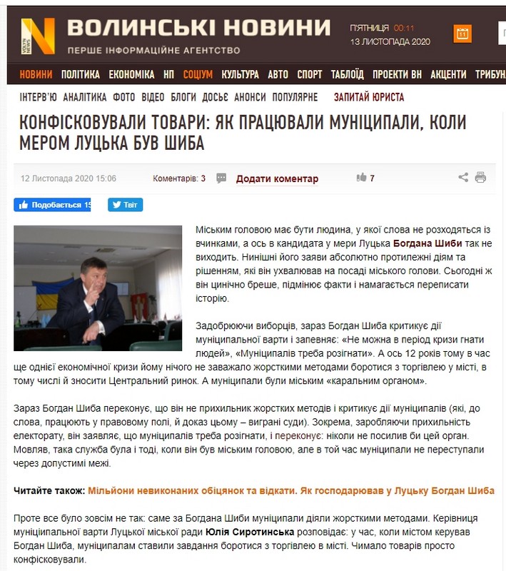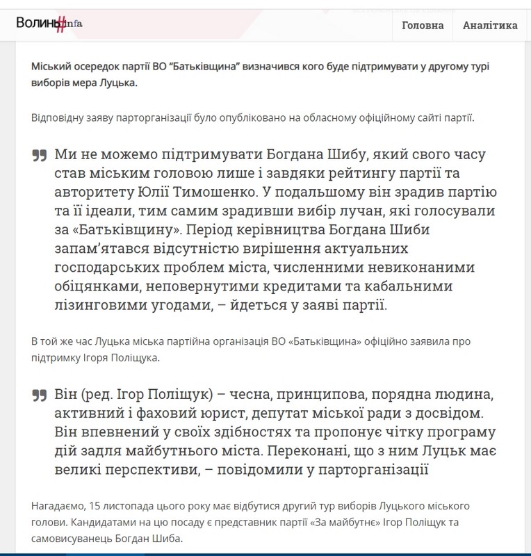 У листопаді волинські онлайн-ЗМІ чимало писали про кандидатів на посаду Луцького міського голови. Ігор Поліщук («За майбутнє») має у рази менше позитивних публікацій на свою користь, проте щодо нього у ЗМІ не вдалося знайти негативних новин. Натомість про Богдана Шибу (самовисування) частина ЗМІ писала у позитивному ключі, а ті, котрі присвятили увагу Ігорю Поліщуку – у негативному.