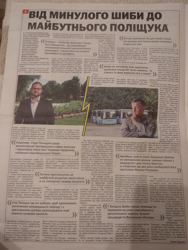 У випуску «Твого вибору» за 12-18 листопада також вийшла публікація «Шиба вчергове збрехав: Бондарук виступив категорично проти нього» (до слова, аналогічні за змістом публікації виходили й у двох онлайн-ЗМІ) та великий матеріал «Від минулого Шиби до майбутнього Поліщука», де кандидатів протиставляють один одному – щодо Ігоря Поліщука описують позитив, натомість про Богдана Шибу – у ключі можливих проблем.