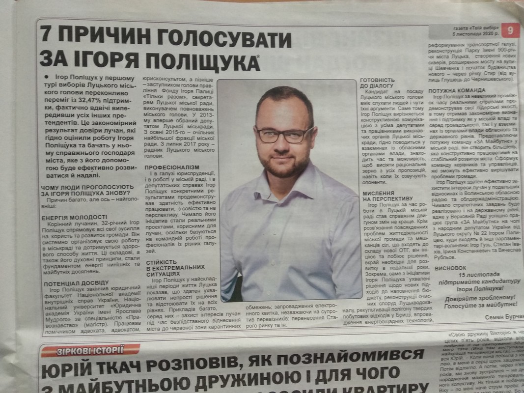 Також «позитив» виявили й на шпальтах друкованого ЗМІ. Зокрема, у газеті «Твій вибір» за 5-11 листопада вийшов матеріал «7 причин голосувати за Ігоря Поліщука», а також тут розмістили звернення кандидата, в якому він закликає 15 листопада підтримати його кандидатуру.