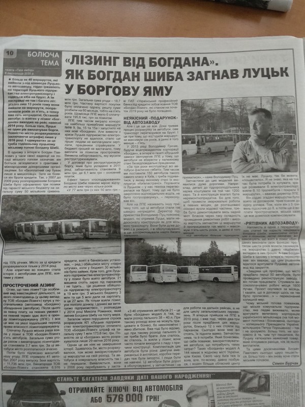 Щодо друкованих ЗМІ, то у газеті «Волинь» за 5 листопада опублікували у рубриці «Політика» інтерв’ю «Я вже переможець, бо я – з лучанами», – кандидат на посаду мера Луцька Богдан Шиба». Ідентичний матеріал розмістили у газеті «Твій вибір» за 5-11 листопада. Проте тут також опублікували критичну публікацію «Лізинг від Богдана». Як Богдан Шиба загнав Луцьк у боргову яму».
