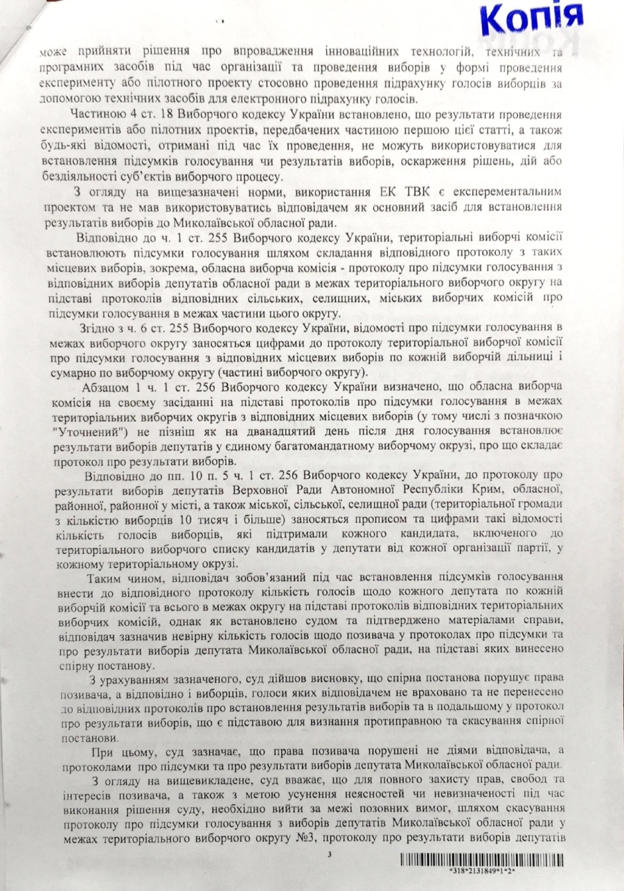 Під час розгляду справи суд встановив, що кількість голосів за позивача в протоколах територіальних комісій округу №3 дійсно не відповідає кількості голосів, зазначених у протоколі про підсумки голосування і результати голосування. Також суд зазначив, що права позивача порушені не діями відповідача, а протоколами про результати виборів депутата Миколаївської обласної ради.