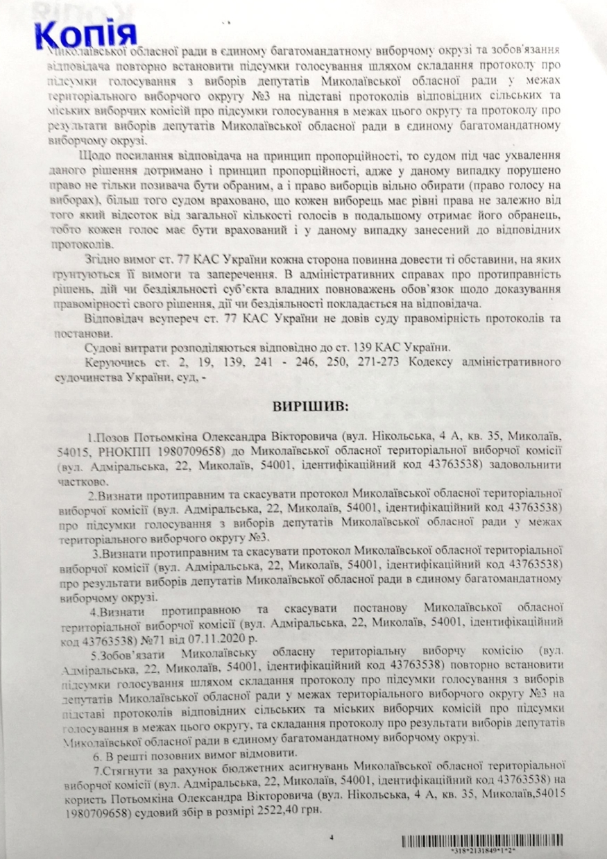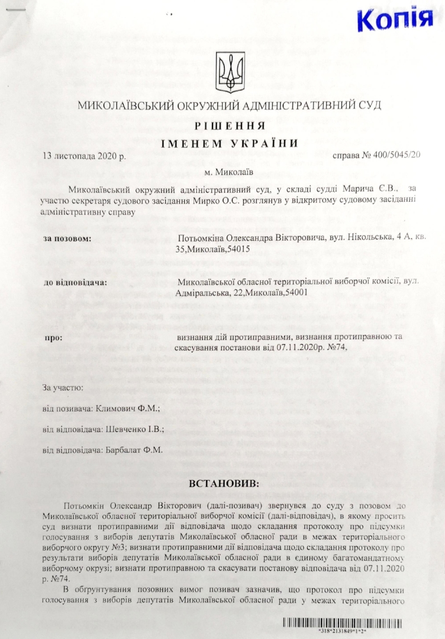 Кандидат у депутати обласної ради від місцевого осередку партії «Опозиційна платформа - За життя» Олександр Потьомкін звернувся до адміністративного суду з проханням визнати протиправними дії Миколаївської обласної ТВК щодо складання протоколу про голосування з виборів депутатів обласної ради в межах виборчого округу №3 та в єдиному багатомандатному виборчому окрузі, які, на думку кандидата, були складені з арифметичними помилками. Також кандидат попросив суд скасувати Постанову обласної ТВК №74 від 7 листопада.
