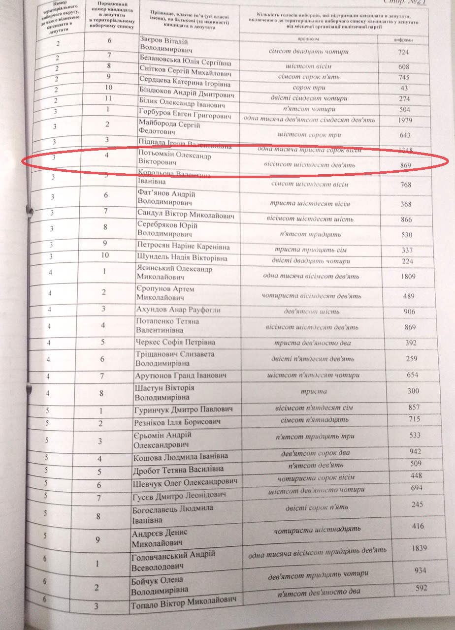 Судове засідання відбулося 13 листопада. Як пояснив у суді Ілля Шевченко, представник відповідача – обласної ТВК, під час встановлення підсумків голосування комісія для перенесення даних у протоколи про підсумки голосування і результати голосування використовувала електронний кабінет ТВК. Хоча в пункті 2 частини 1 статті 18 Виборчого кодексу України зазначено, що використання технічних засобів під час підрахунку голосів є експериментальним або пілотним проєктом. Також представник відповідача підтвердив, що під час перенесення даних у протоколи обласна ТВК допустила технічну помилку в бік зменшення кількості голосів позивача Олександра Потьомкіна.