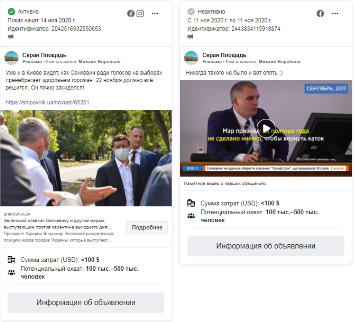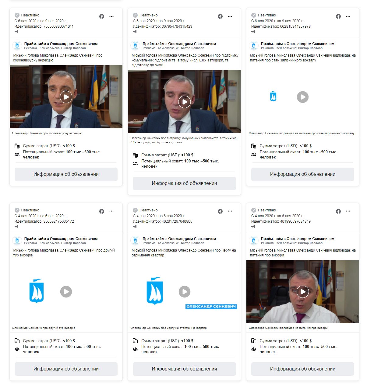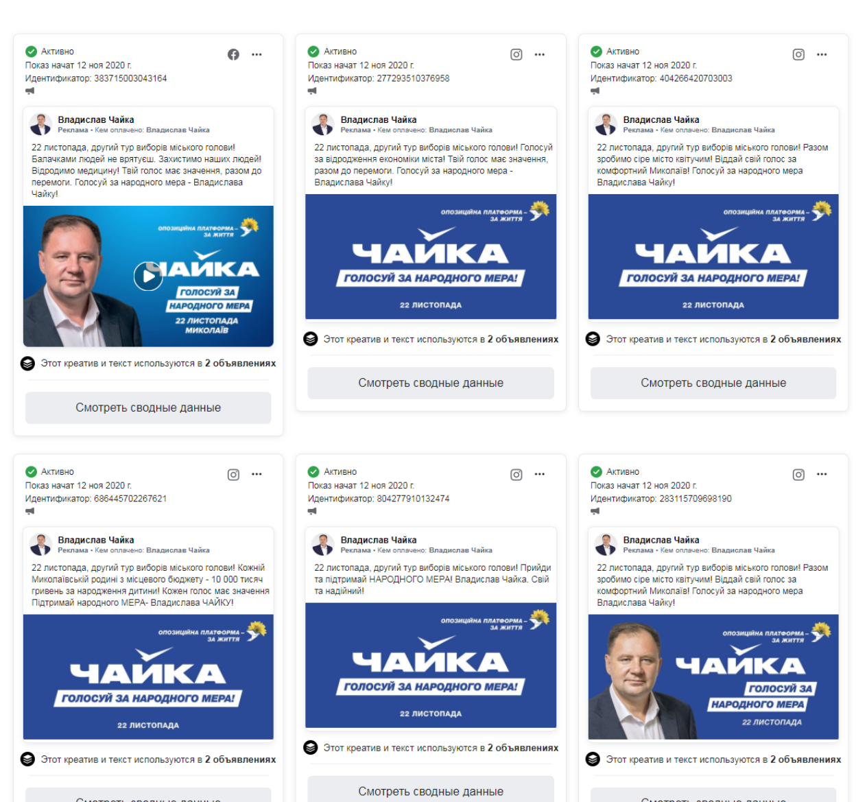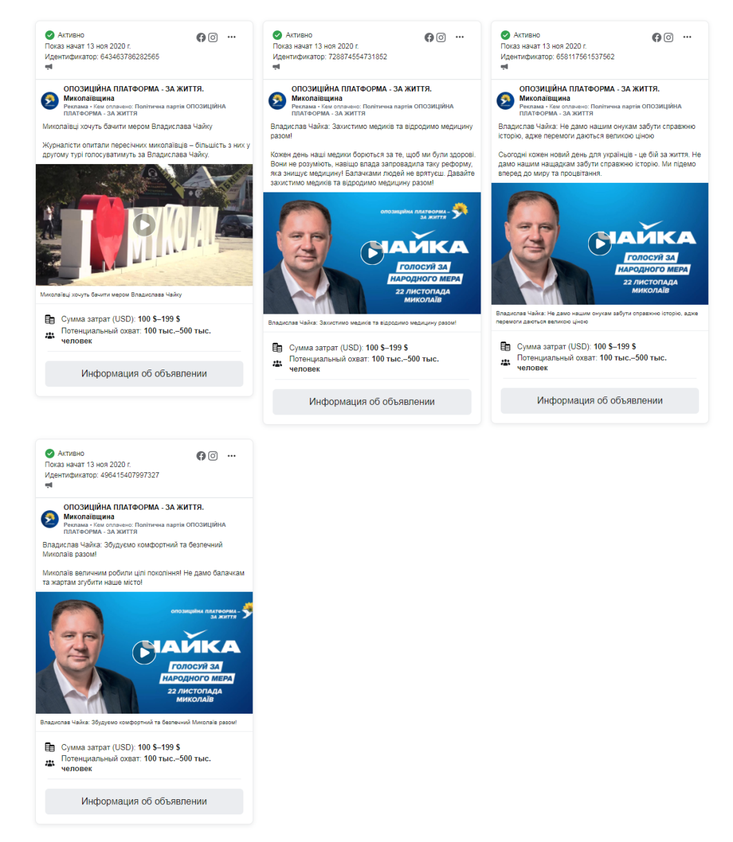 Також, за даними бібліотеки політичної реклами Facebook, у перші два тижня листопада політична реклама таргетувалась на миколаївську аудиторію й зі сторінки «Опозиційна платформа – За життя. Миколаївщина». Чотири рекламні оголошення вартістю до 800 доларів були оплачені політичною партію ОПЗЖ. Вони рекламували кандидата на посаду міського голови Владислава Чайку та містили заклик підтримати його в «другому турі» місцевих виборів.