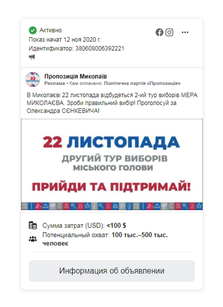 Разом із тим зі сторінки «Пропозиція Миколаїв» було запущене одне рекламне оголошення вартістю до 100 доларів, присвячене повторному голосуванню за кандидатів на посаду міського голови. «В Миколаєві 22 листопада відбудеться 2-ий тур виборів МЕРА МИКОЛАЄВА. Зроби правильний вибір! Проголосуй за Олександра СЄНКЕВИЧА!», − сказано оголошенні.