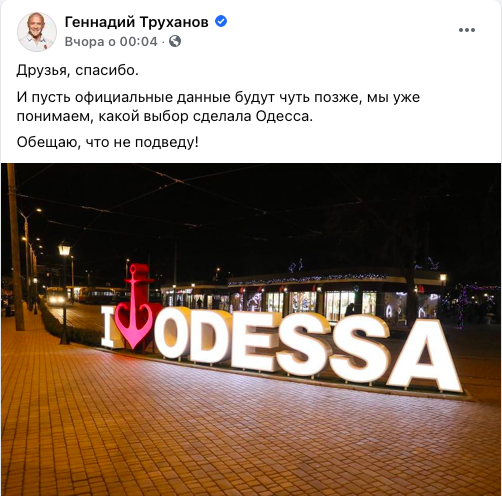 17 листопада Одеська міська територіальна виборча комісія оголосила офіційні результати виборів міського голови. Переміг Геннадій Труханов – висуванець міської організації політичної партії «Довіряй ділам», який набрав 54,28% голосів виборців.