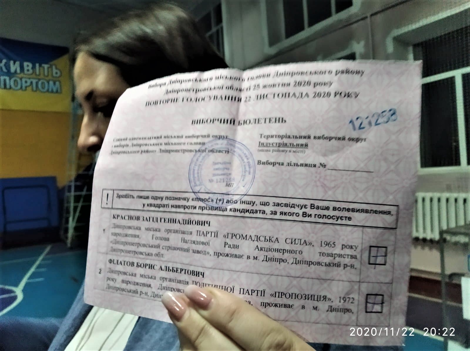 Спостерігачі ОПОРИ 22 листопада протягом дня фіксували фотографування бюлетенів у кабінках для голосування на дільницях. У період з 8:00 до 20:00 спостерігачі ОПОРИ зафіксували 31 випадок (30 – у Дніпрі, 1 – у Нікополі. Після виявлення цих інцидентів деякі бюлетені будуть не враховані.