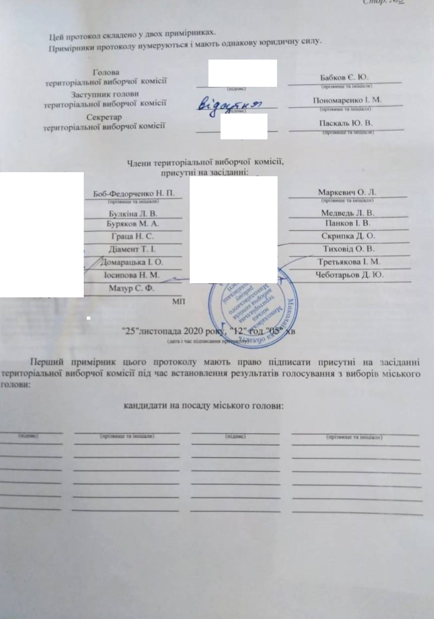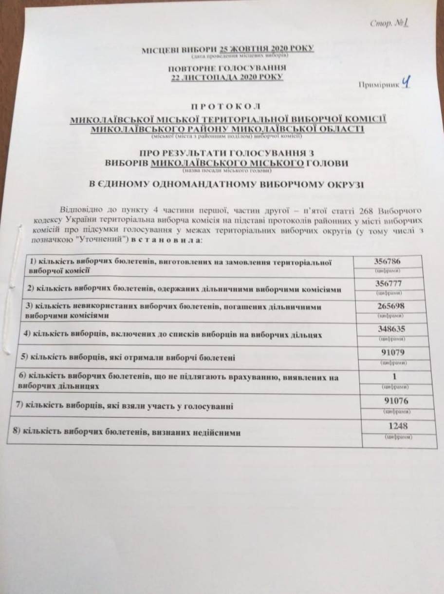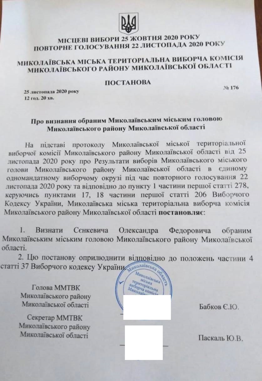 Протокол підписали 16 членів Миколаївської міської ТВК. Така ж кількість проголосувала за Постанову про визнання обраним Миколаївським міським головою Олександра Сєнкевича.