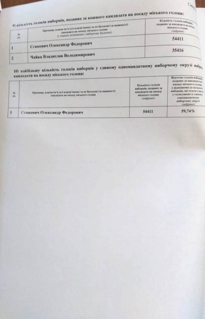 25 листопада Миколаївська міська ТВК оголосила результати повторного голосування за міського голову. За даними протоколу, переміг Олександр Сєнкевич. Про це повідомляє спостерігач ОПОРИ.