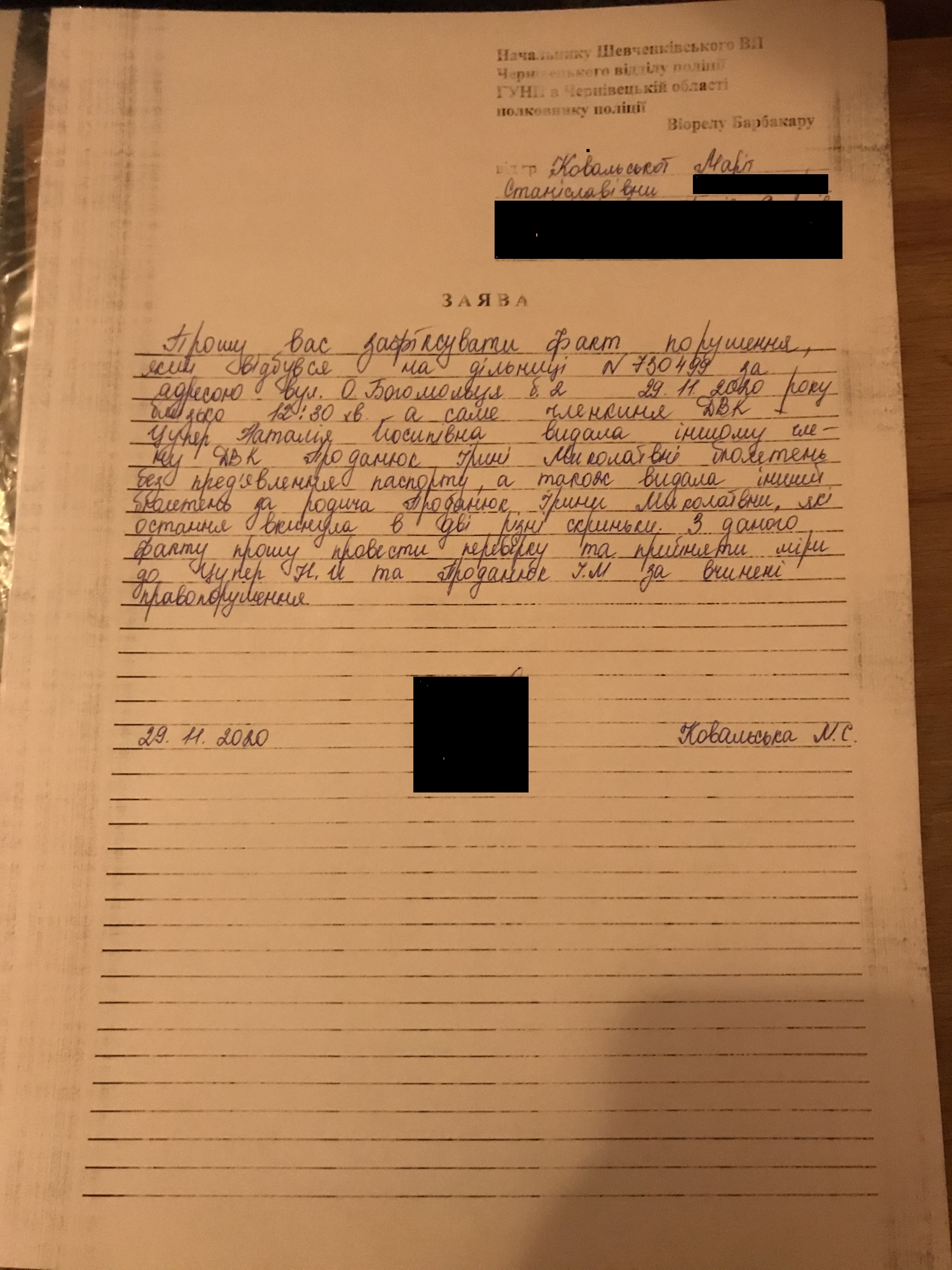 У Чернівцях на дільниці №730499 членкиня дільничної виборчої комісії проголосувала за себе та за свого сина. Спостерігач ОПОРИ викликав поліцію та написав заяву.