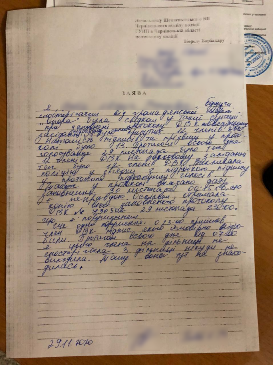 За словами спостерігачки, протягом дня від 7:00 і до завершення вечірнього засідання дільничної виборчої комісії працювало 12 членів комісії. Спостерігачка не виходила за межі приміщення для голосування. Натомість у протоколі поставлено підписи 13 осіб із зазначеними прізвищами. Спостерігачка написала заяву до поліції.