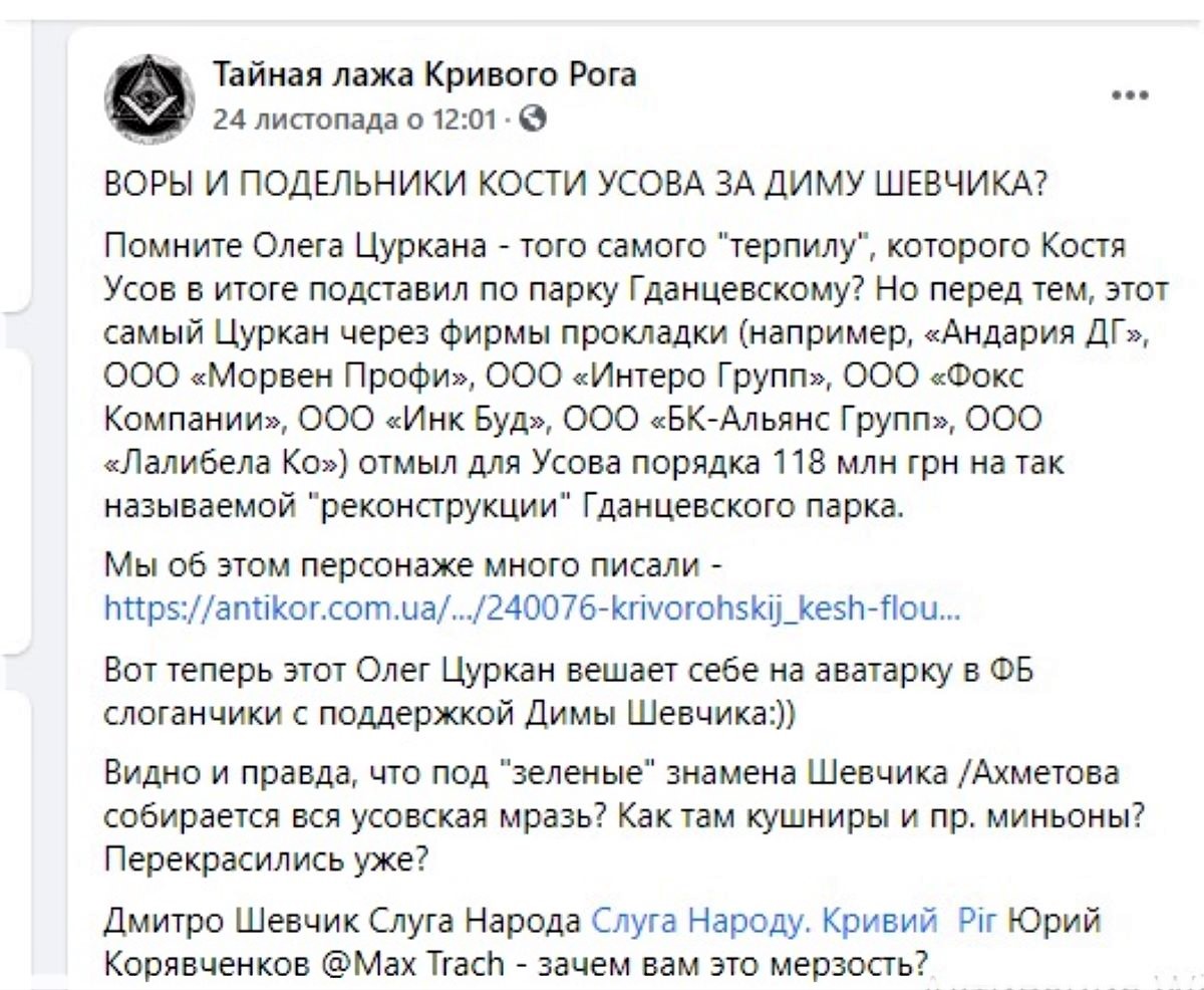 Дописи проти Костянтина Павлова («Опозиційна платформа – За життя») публікуються на фейсбук-сторінці «Зла швабра», проти Дмитра Шевчика («Слуга народу») – у спільноті «Таємна лажа Кривого Рогу».