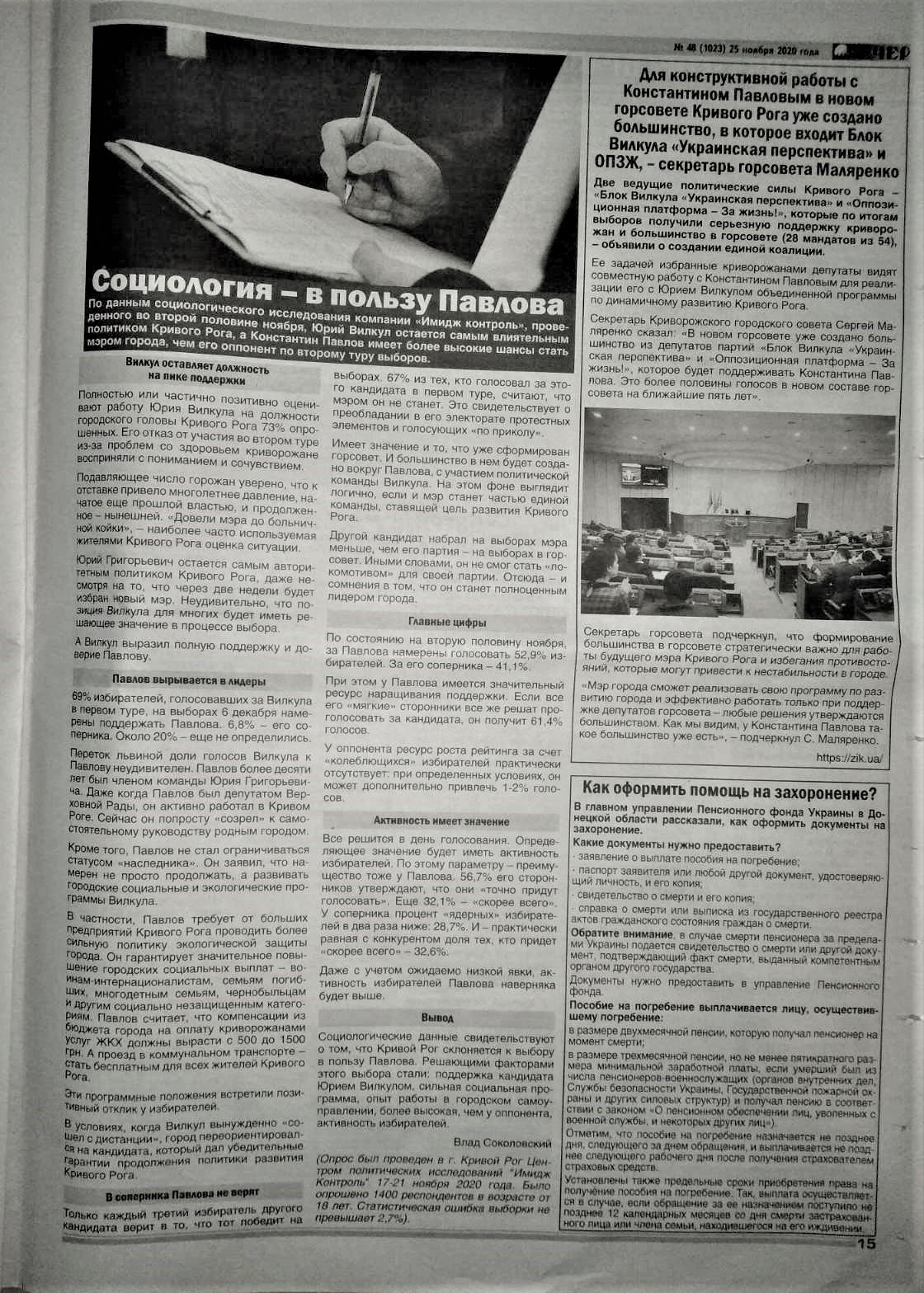 У газеті «Вечір» від 25 листопада опублікований матеріал під назвою «Соціологія – на користь Павлова». Зазначено, що опитування проводила компанія «Імідж контроль» 17 - 21 листопада, було опитано 1400 респондентів. У статті наводяться такі цифри: 52,9% виборців мають намір голосувати за Костянтина Павлова, 41,1% – за його суперника (прізвище другого кандидата Дмитра Шевчика не згадується). Наводимо цитату з матеріалу: «Має значення, і те, що вже сформована міськрада. І більшість в ньому буде створена навколо Павлова, за участю політичної команди Вілкула. На цьому фоні виглядає логічним, якщо і мер стане частиною єдиної команди, яка ставить за мету розвиток Кривого Рогу». В матеріалі перелічуються пункти передвиборчої програми тільки кандидата Костянтина Павлова, натомість Дмитро Шевчик згадується лише як «опонент», «інший кандидат», «суперник».