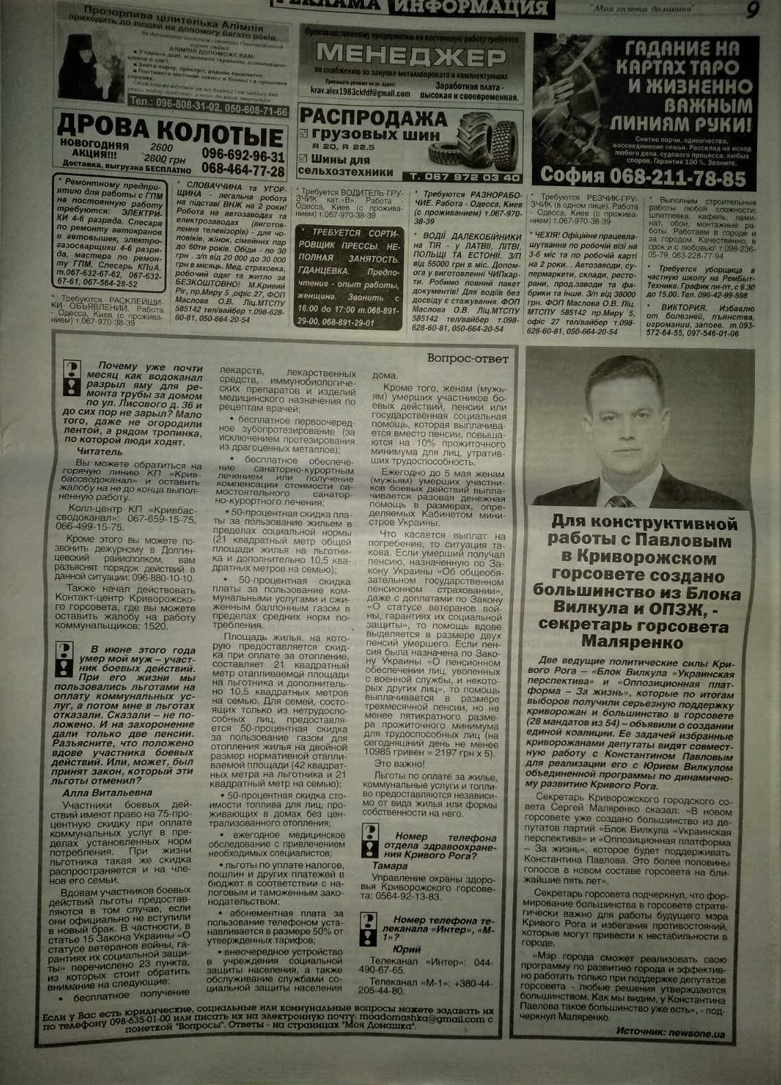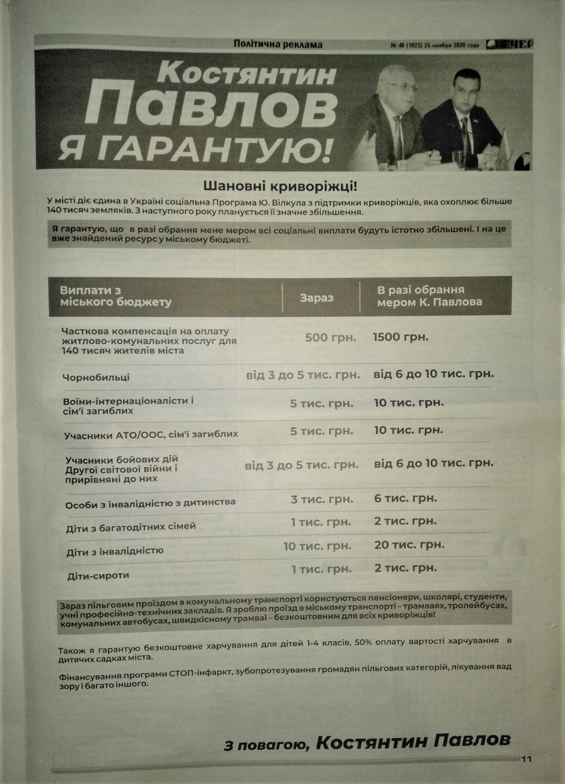 Поряд розміщений інший матеріал під назвою «Для конструктивної роботи з Костянтином Павловим в новій міськраді Кривого Рогу вже створена більшість, до якої входять Блок Вілкула «Українська перспектива» і ОПЗЖ». Публікації не марковані як політична реклама.