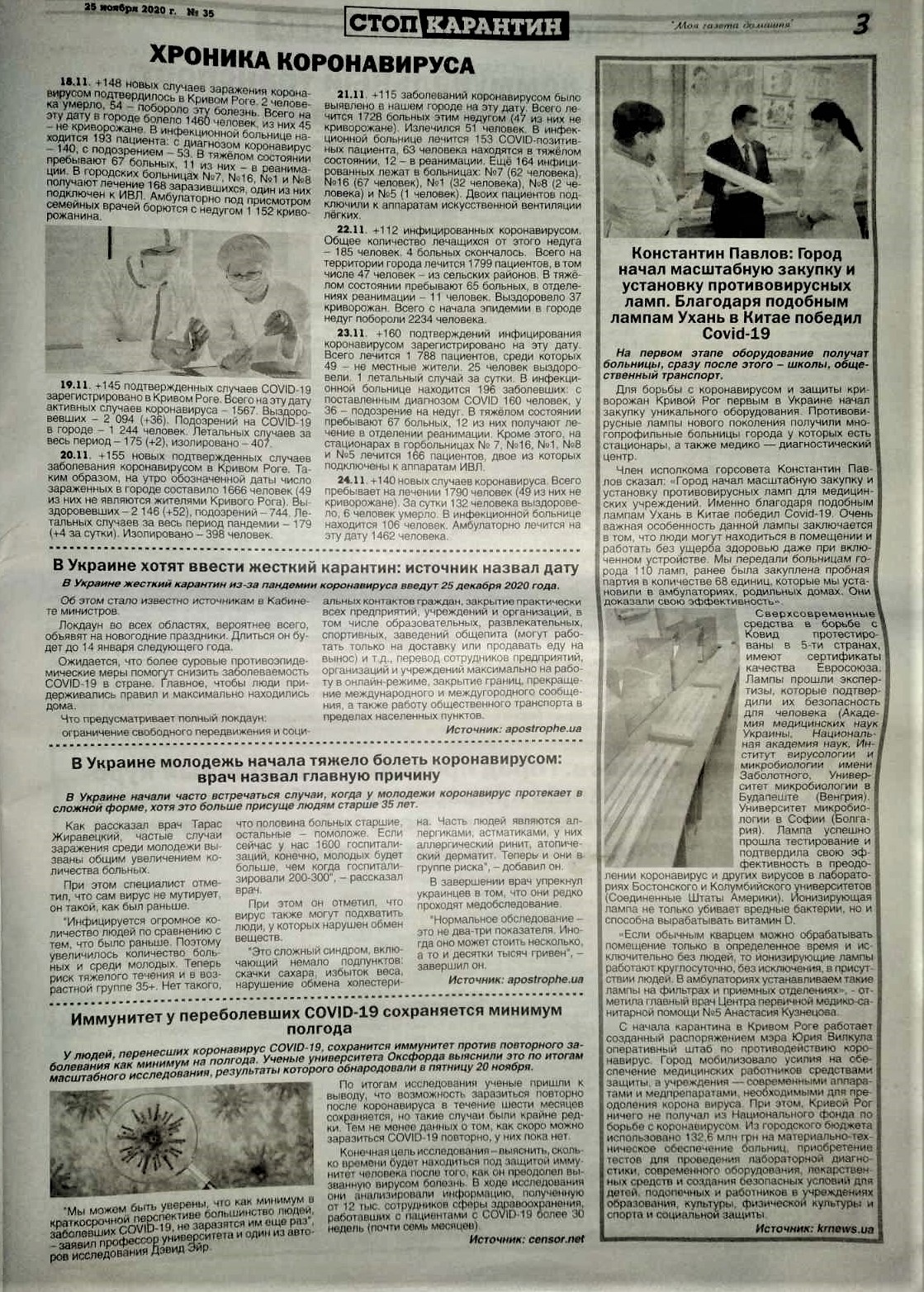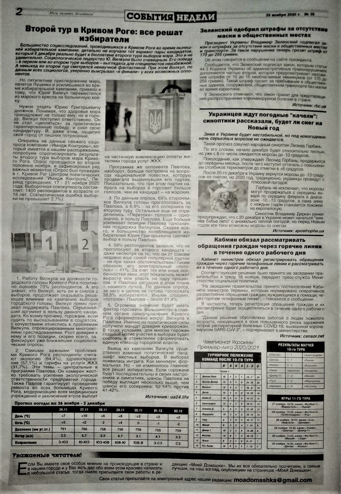 У виданні «Моя домашня газета» також від 25 листопада опубліковане те ж саме опитування, але джерелом зазначений сайт ua24.life. Цілі абзаци цього тексту у тих самих формулюваннях повторюють матеріал в газеті «Вечір». Відмінність можна помітити лише в останньому абзаці: «Якщо містяни будуть послідовні у своїх настроях та симпатіях, шанси Павлова на перемогу виглядають вище, ніж шанси його суперника». На іншій шпальті газети опублікований матеріал «Костянтин Павлов: місто почало масштабну закупівлю та встановлення противовірусних ламп. Завдяки подібним лампам Ухань в Китаї переміг Covid - 19». В статті не намагаються розібратися, чи відповідає ця інформація дійсності, натомість зазначено, що це передрук з сайту krnews.ua. Маркування відсутнє.