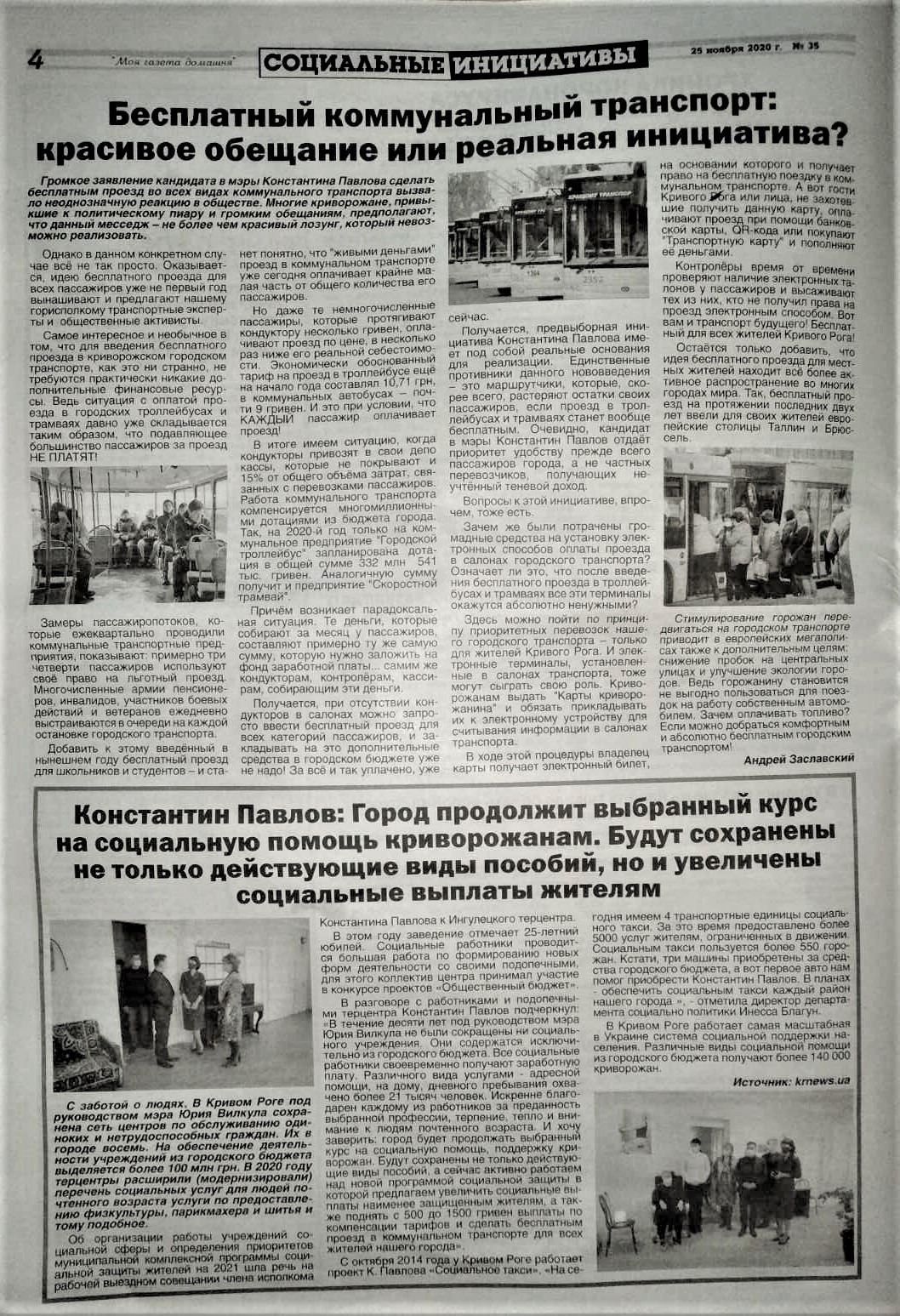 На іншій шпальті видання «Моя домашня газета» від 25 листопада є матеріали «Безкоштовний комунальний транспорт: красива обіцянка чи реальна ініціатива» та «Костянтин Павлов: місто продовжить обраний курс на соціальну допомогу криворіжцям. Будуть збережені не тільки існуючі види допомоги, будуть збільшені соціальні виплати мешканцям». В обох матеріалах згадуються ініціативи Костянтина Павлова в компліментарному стилі. На іншій шпальті опублікований матеріал, ідентичний такому ж в газеті «Вечір», з однаковою назвою «Для конструктивної роботи з Костянтином Павловим в новій міськраді Кривого Рогу вже створена більшість, до якої входять Блок Вілкула «Українська перспектива» і ОПЗЖ». Публікації не марковані як політична реклама.
