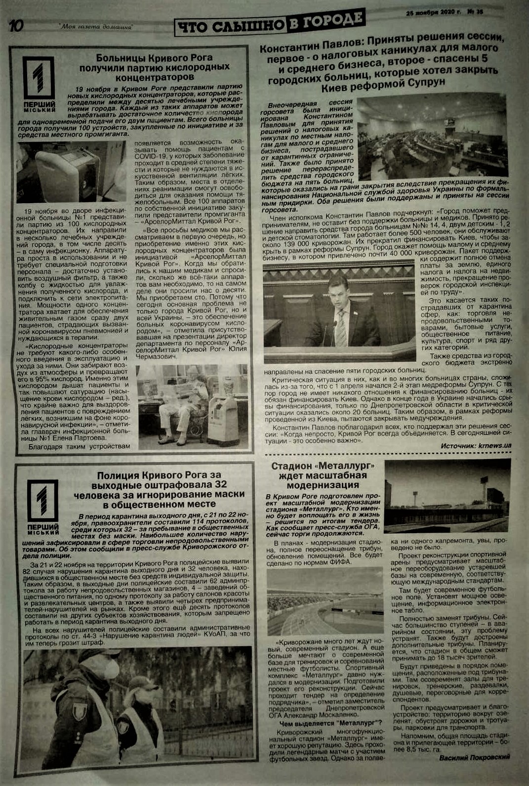 Вже на 10-й шпальті газети знову згадується Костянтин Павлов у матеріалі «Костянтин Павлов: Прийняті рішення сесії, перше – про податкові канікули для малого та середнього бізнесу, друге – врятовані 5 лікарень, які хотів закрити Київ реформою Супрун». В статті цитується член міського виконкому Костянтин Павлов, думки інших депутатів не наводяться. Маркування відсутнє.