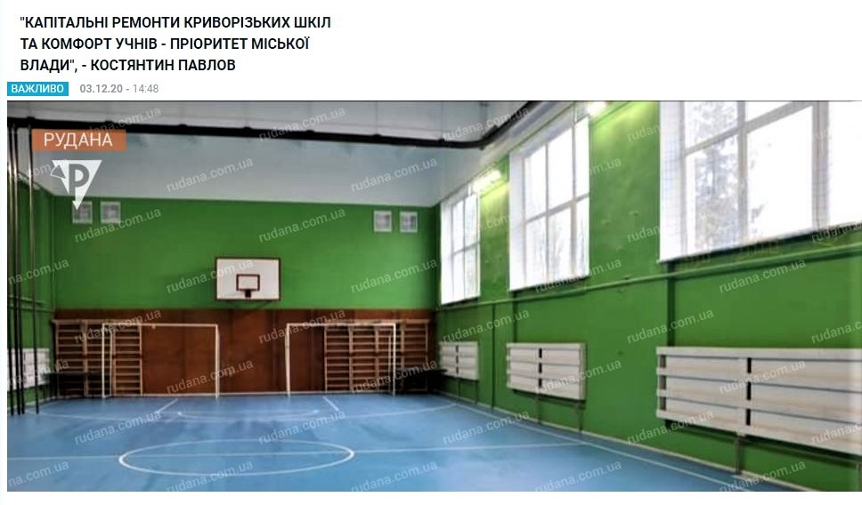 3 грудня на сайті «Рудани» розміщено матеріал «Капітальні ремонти Криворізьких шкіл та комфорт учнів – пріоритет міської влади, - Костянтин Павлов». В ньому розповідається про капітальний ремонт спортивного залу в гімназії №46 коштом міського бюджету. При цьому Костянтин Павлов як член виконкому міської ради говорить: «Місто й надалі продовжуватиме модернізувати школи. Комфортні умови для навчання дітей та роботи вчителів криворізьких шкіл були, є і будуть пріоритетом міської влади».